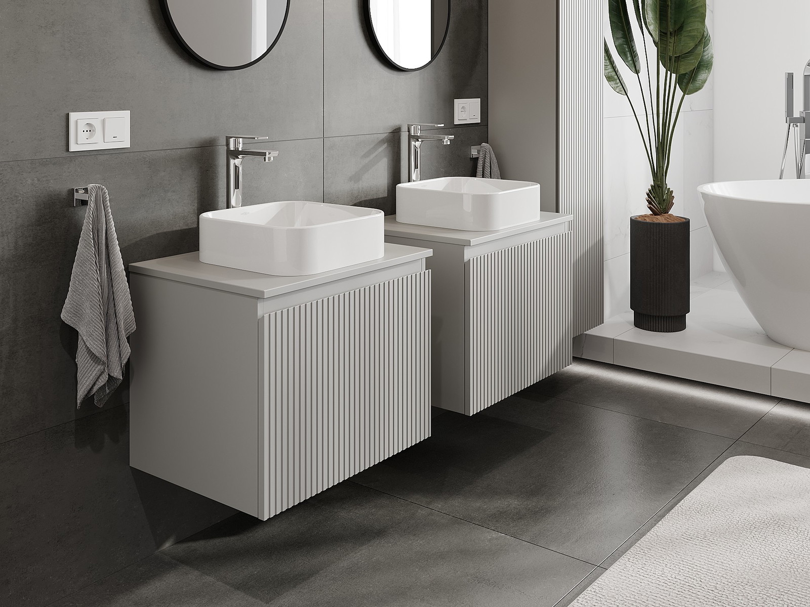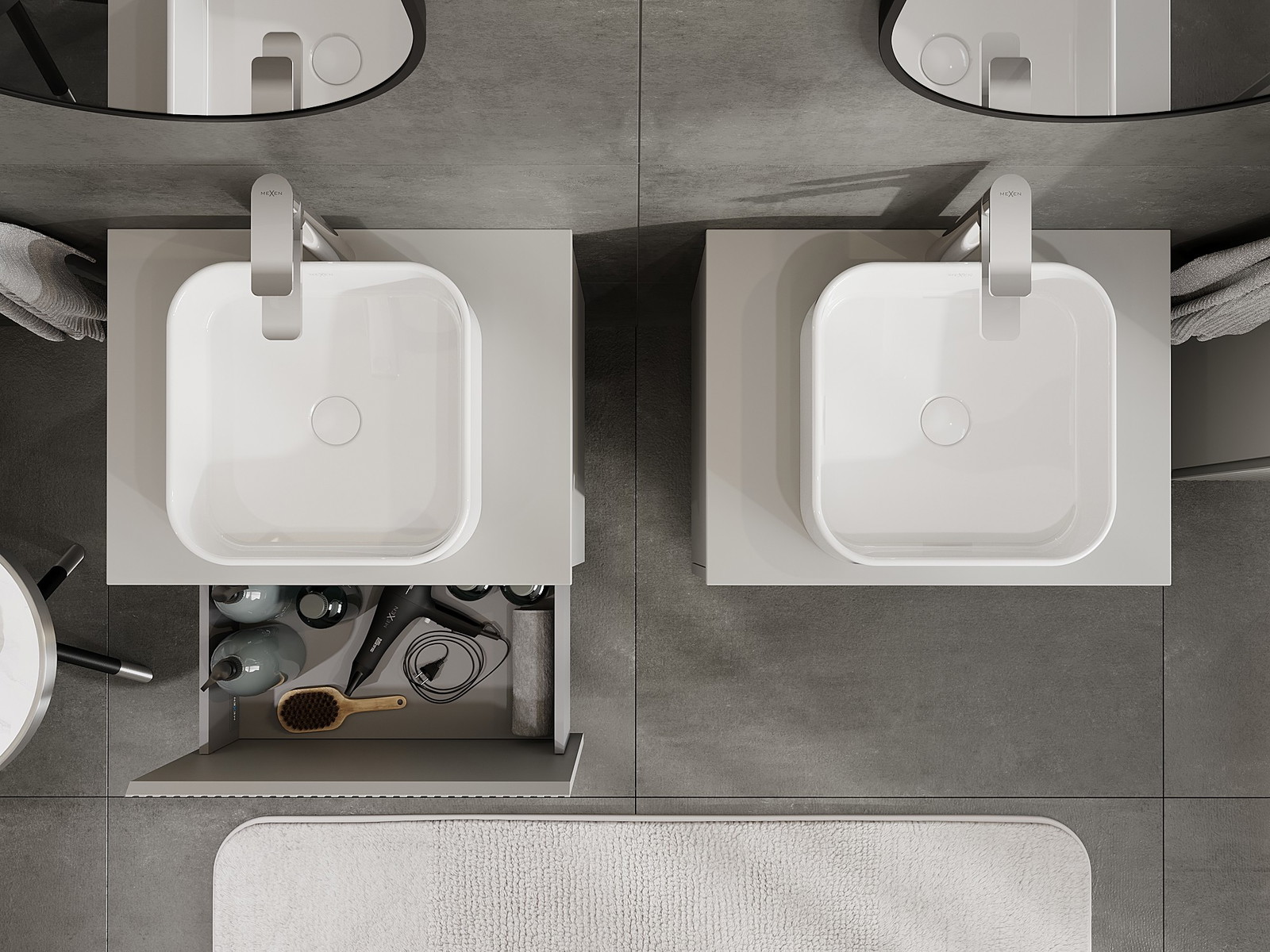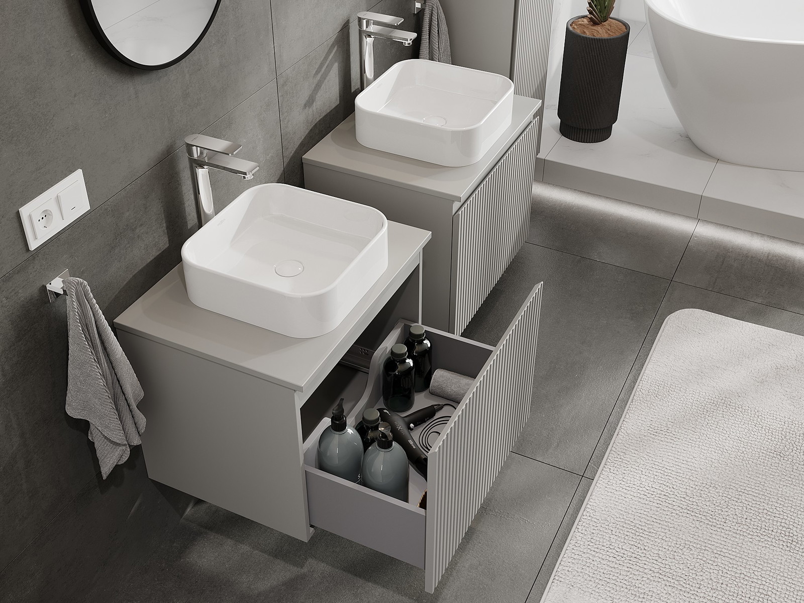 A moduláris fürdőszobabútorainkat különböző színkonfigurációkban lehet kombinálni, lehetővé téve a teljes személyre szabást. Kiválasztható mind az egyes elemek megjelenése, mind pedig funkciói, ami lehetővé teszi a bútorok személyes stílus- és használati preferenciákhoz való igazítását.