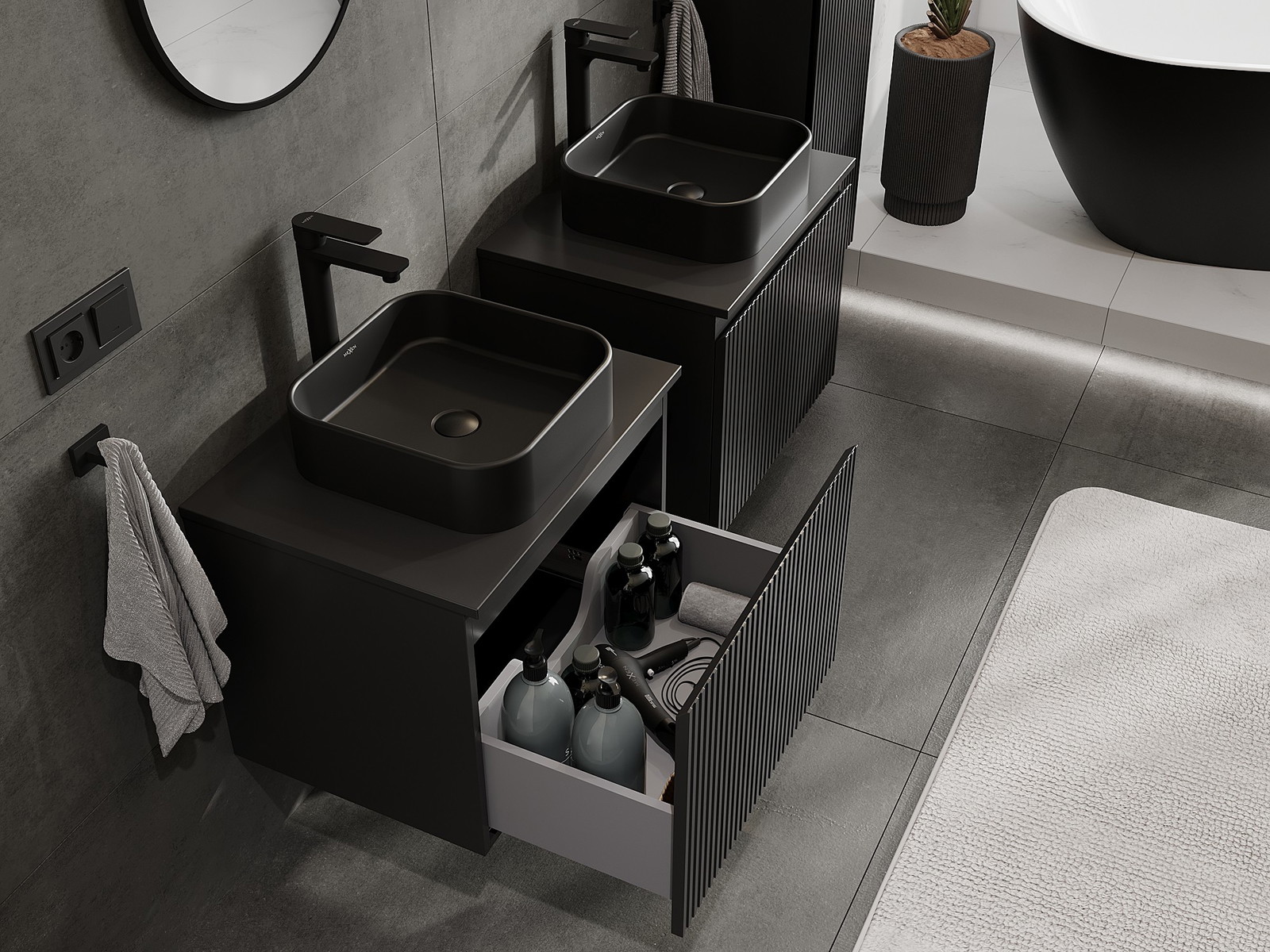 A moduláris fürdőszobabútorainkat különböző színkonfigurációkban lehet kombinálni, lehetővé téve a teljes személyre szabást. Kiválasztható mind az egyes elemek megjelenése, mind pedig funkciói, ami lehetővé teszi a bútorok személyes stílus- és használati preferenciákhoz való igazítását.