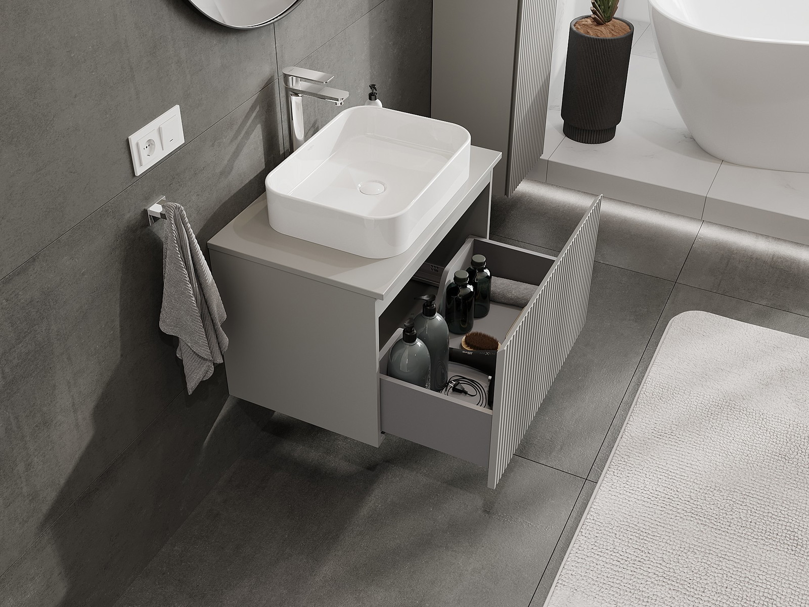 A fiókban lévő kivágás úgy van kialakítva, hogy befogadja a mosdó telepítéseknél szükséges szifont. Ennek köszönhetően a bútor teljesen funkcionálisan felszerelhető anélkül, hogy a fiók terének egy részét fel kellene áldozni a telepítés miatt.