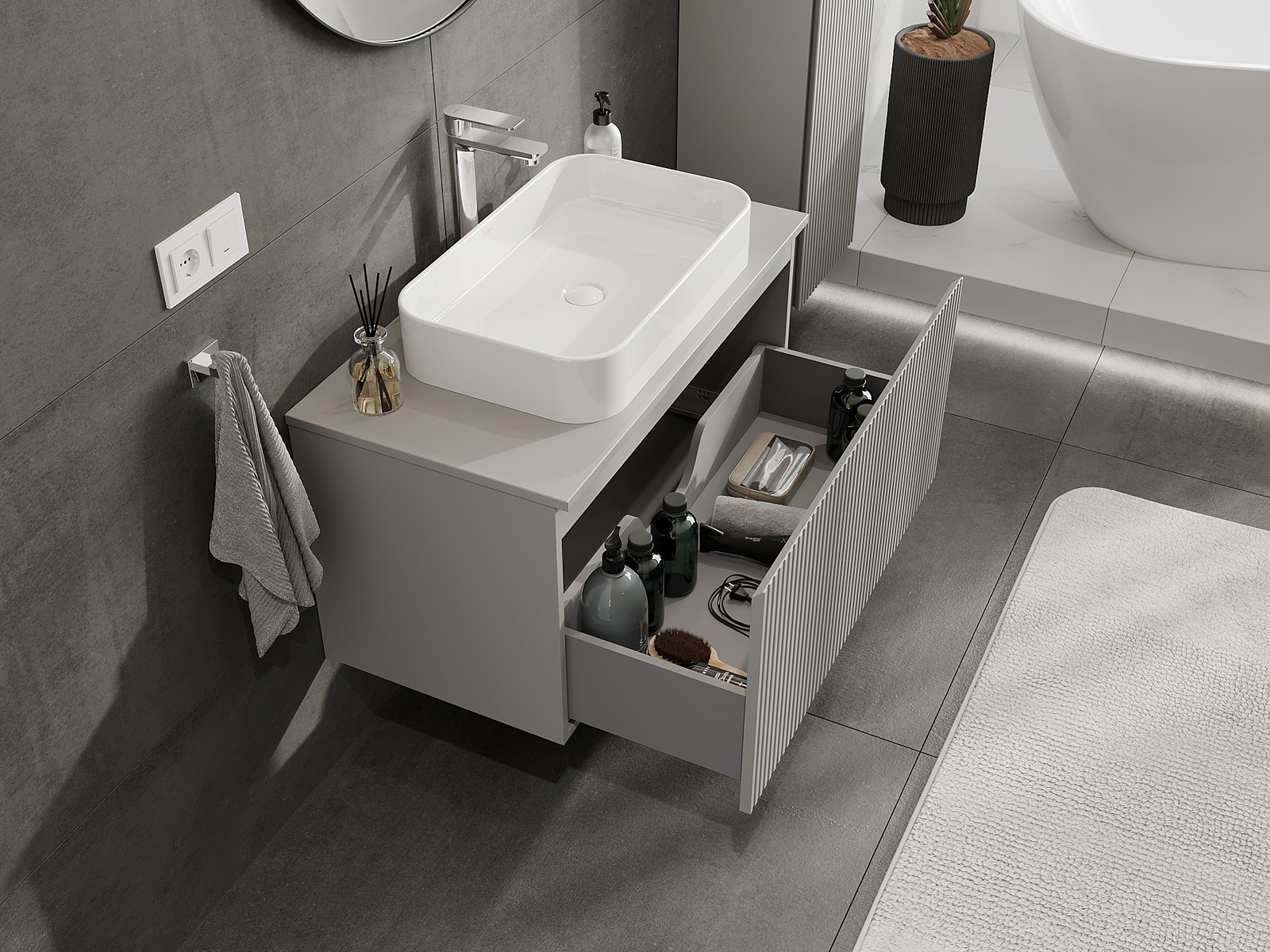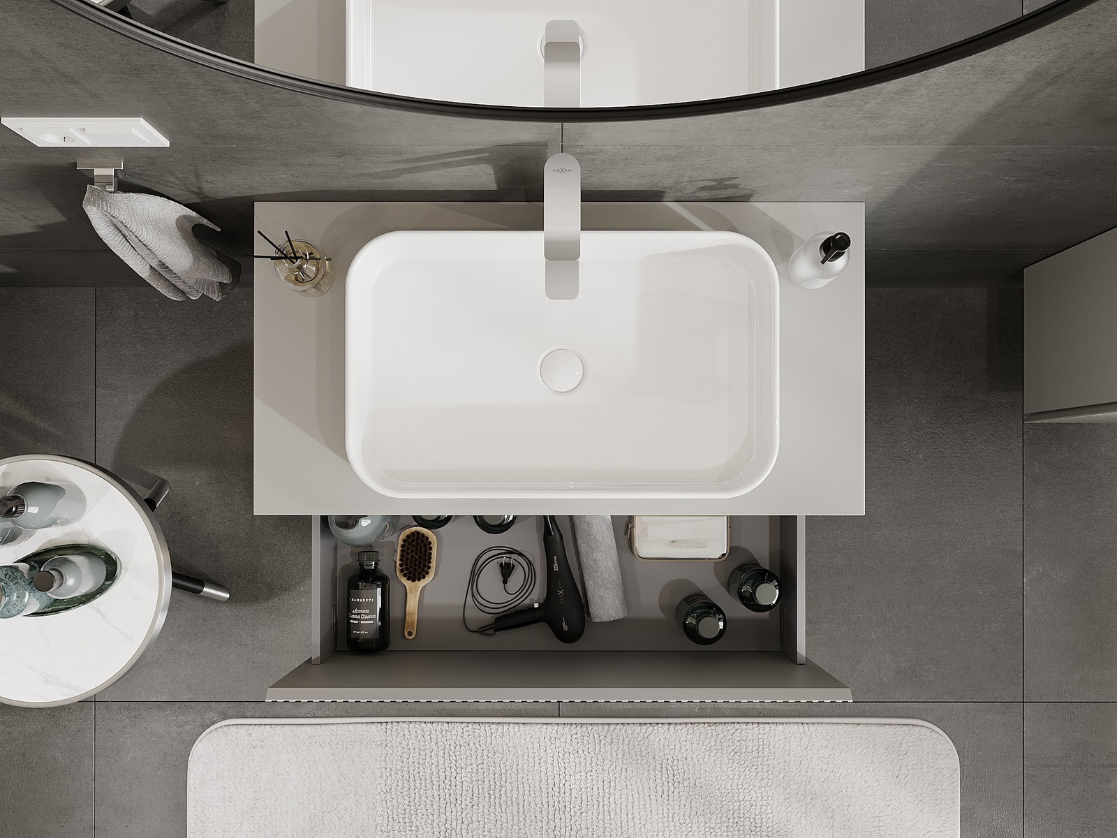 A fiókban lévő kivágás úgy van kialakítva, hogy befogadja a mosdó telepítéseknél szükséges szifont. Ennek köszönhetően a bútor teljesen funkcionálisan felszerelhető anélkül, hogy a fiók terének egy részét fel kellene áldozni a telepítés miatt.