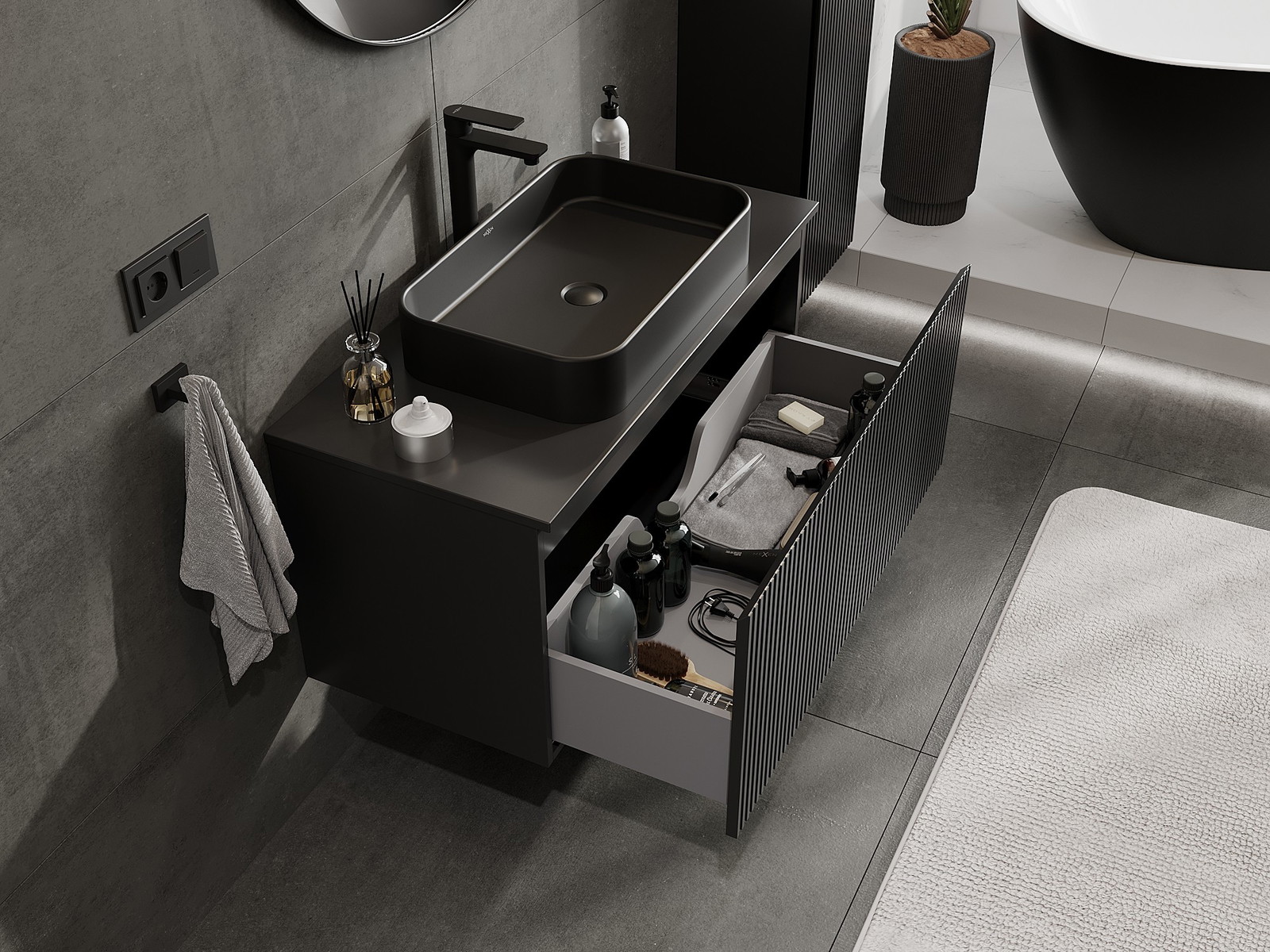 A fiókban lévő kivágás úgy van kialakítva, hogy befogadja a mosdó telepítéseknél szükséges szifont. Ennek köszönhetően a bútor teljesen funkcionálisan felszerelhető anélkül, hogy a fiók terének egy részét fel kellene áldozni a telepítés miatt.