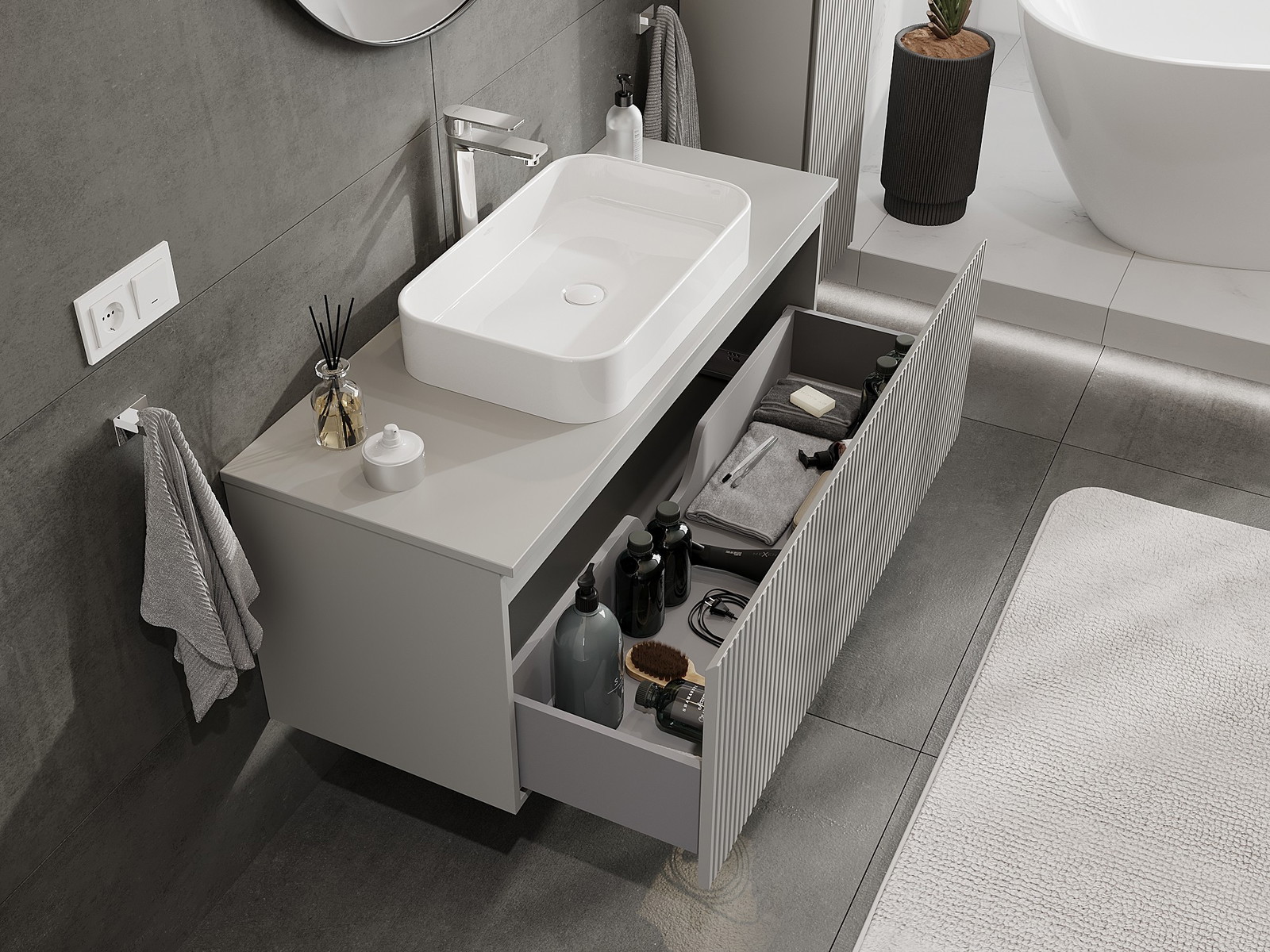 A moduláris fürdőszobabútorainkat különböző színkonfigurációkban lehet kombinálni, lehetővé téve a teljes személyre szabást. Kiválasztható mind az egyes elemek megjelenése, mind pedig funkciói, ami lehetővé teszi a bútorok személyes stílus- és használati preferenciákhoz való igazítását.
