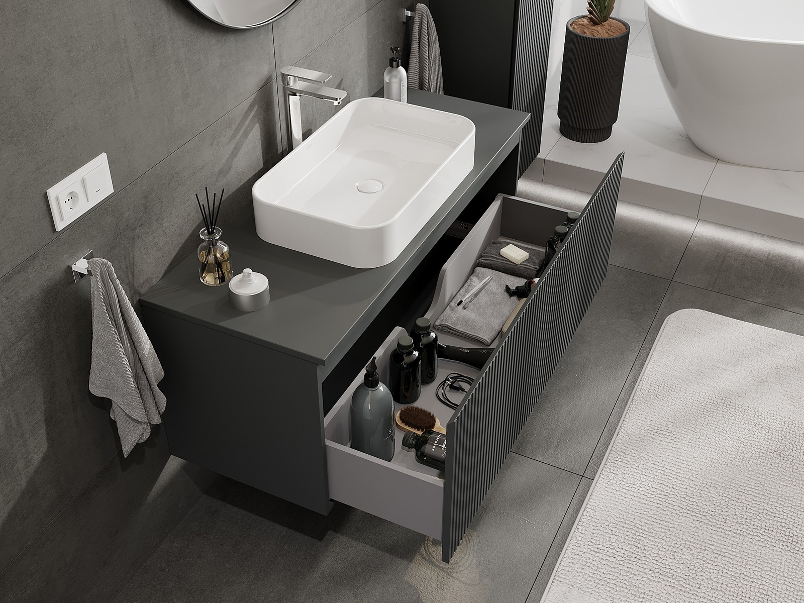 A moduláris fürdőszobabútorainkat különböző színkonfigurációkban lehet kombinálni, lehetővé téve a teljes személyre szabást. Kiválasztható mind az egyes elemek megjelenése, mind pedig funkciói, ami lehetővé teszi a bútorok személyes stílus- és használati preferenciákhoz való igazítását.