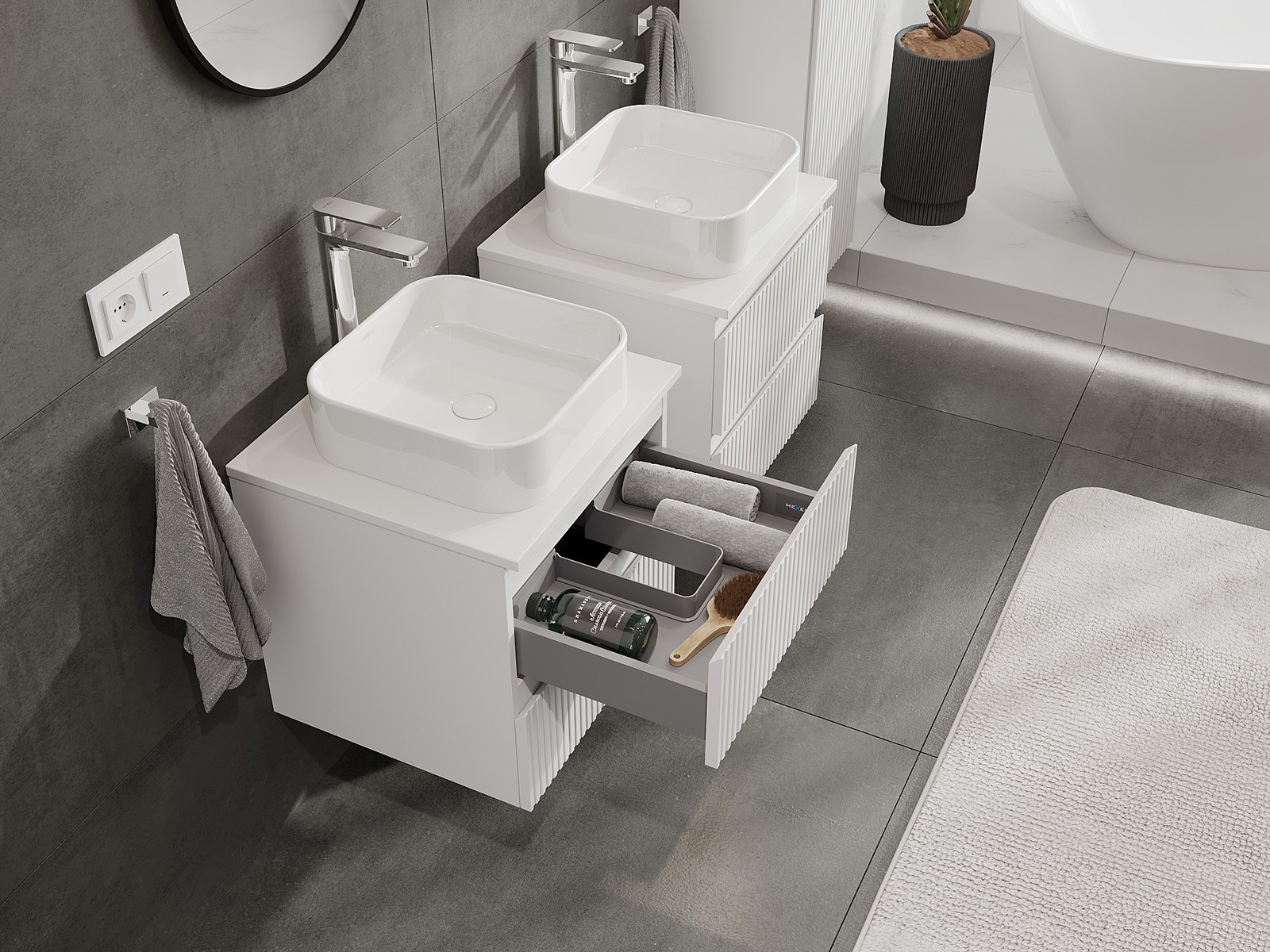 A moduláris fürdőszobabútorainkat különböző színkonfigurációkban lehet kombinálni, lehetővé téve a teljes személyre szabást. Kiválasztható mind az egyes elemek megjelenése, mind pedig funkciói, ami lehetővé teszi a bútorok személyes stílus- és használati preferenciákhoz való igazítását.