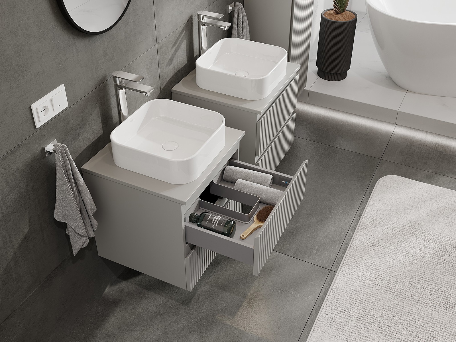 A moduláris fürdőszobabútorainkat különböző színkonfigurációkban lehet kombinálni, lehetővé téve a teljes személyre szabást. Kiválasztható mind az egyes elemek megjelenése, mind pedig funkciói, ami lehetővé teszi a bútorok személyes stílus- és használati preferenciákhoz való igazítását.