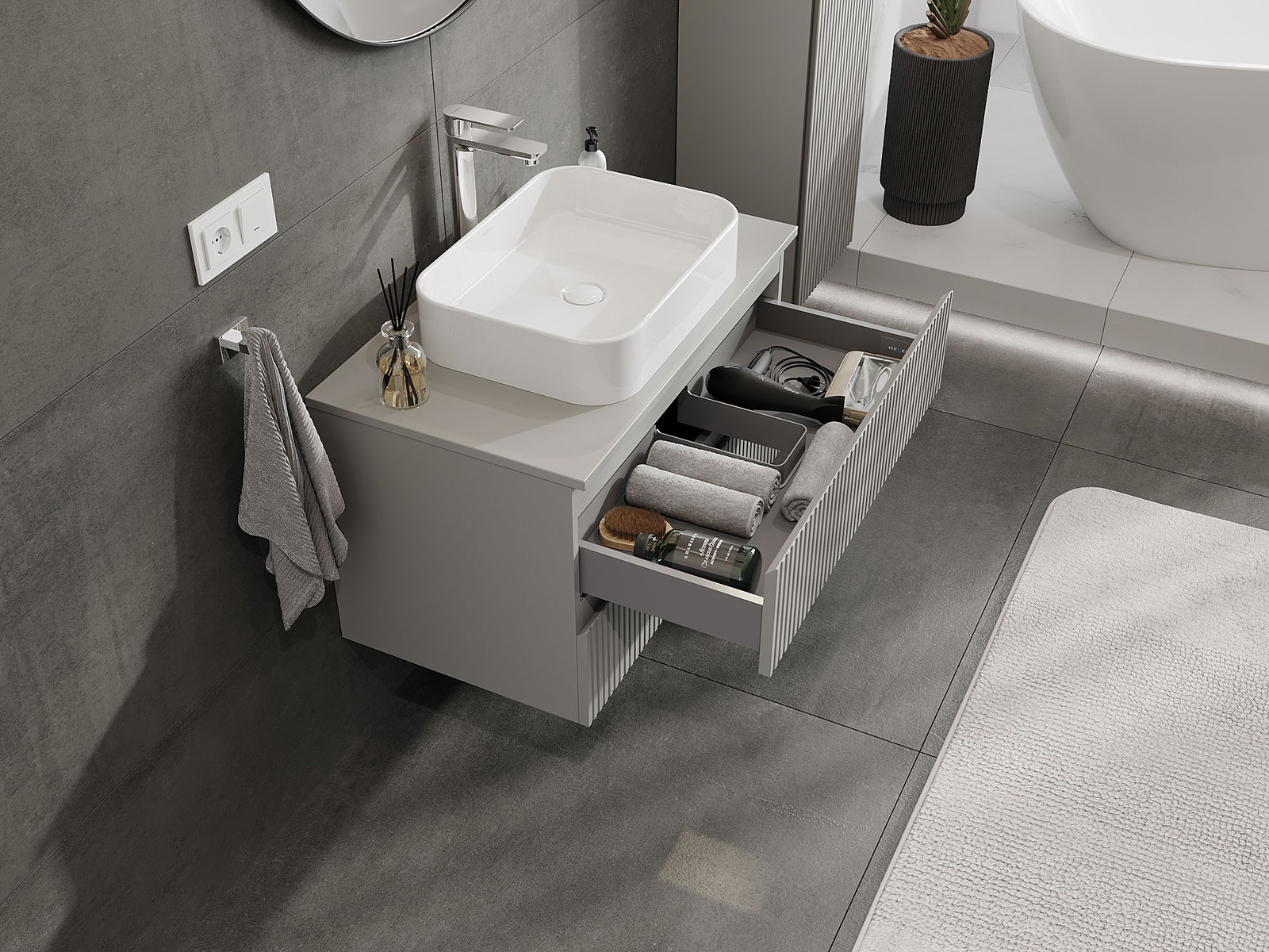 A fiókban lévő kivágás úgy van kialakítva, hogy befogadja a mosdó telepítéseknél szükséges szifont. Ennek köszönhetően a bútor teljesen funkcionálisan felszerelhető anélkül, hogy a fiók terének egy részét fel kellene áldozni a telepítés miatt.