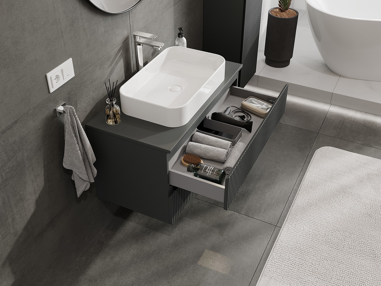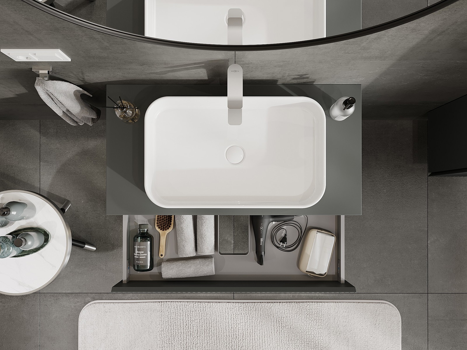 A fiókban lévő kivágás úgy van kialakítva, hogy befogadja a mosdó telepítéseknél szükséges szifont. Ennek köszönhetően a bútor teljesen funkcionálisan felszerelhető anélkül, hogy a fiók terének egy részét fel kellene áldozni a telepítés miatt.