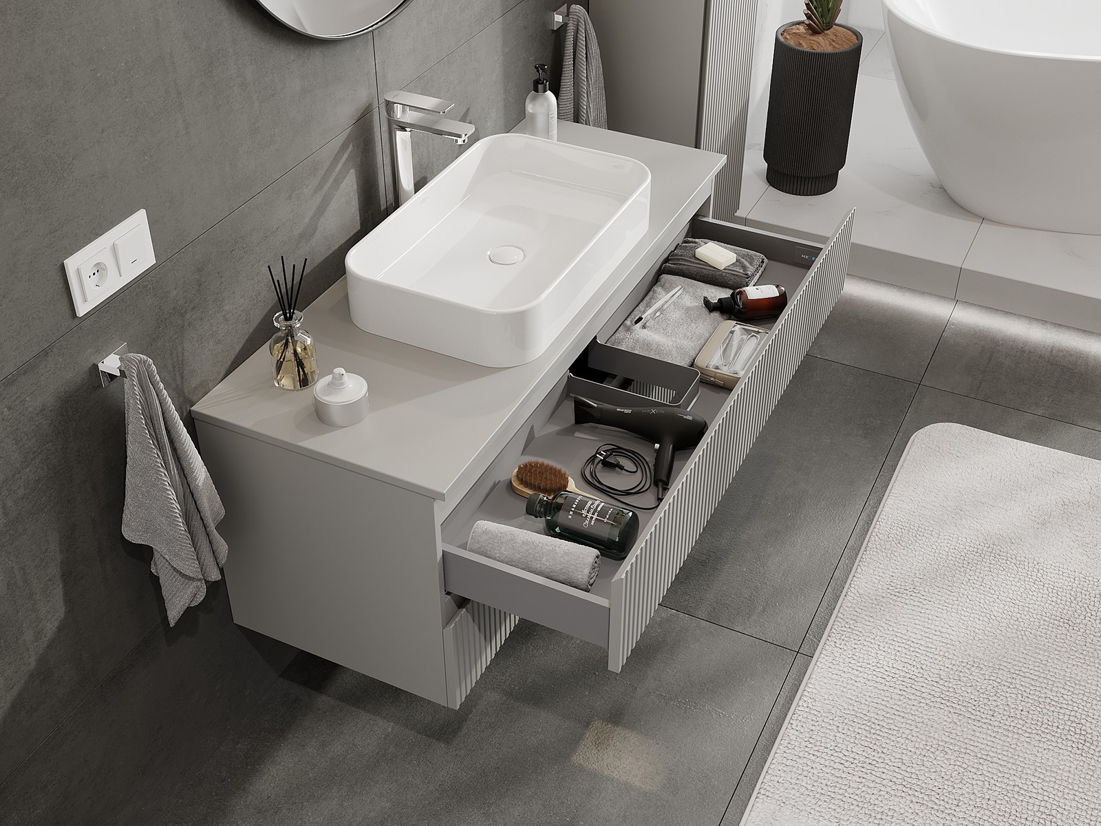 A fiókban lévő kivágás úgy van kialakítva, hogy befogadja a mosdó telepítéseknél szükséges szifont. Ennek köszönhetően a bútor teljesen funkcionálisan felszerelhető anélkül, hogy a fiók terének egy részét fel kellene áldozni a telepítés miatt.