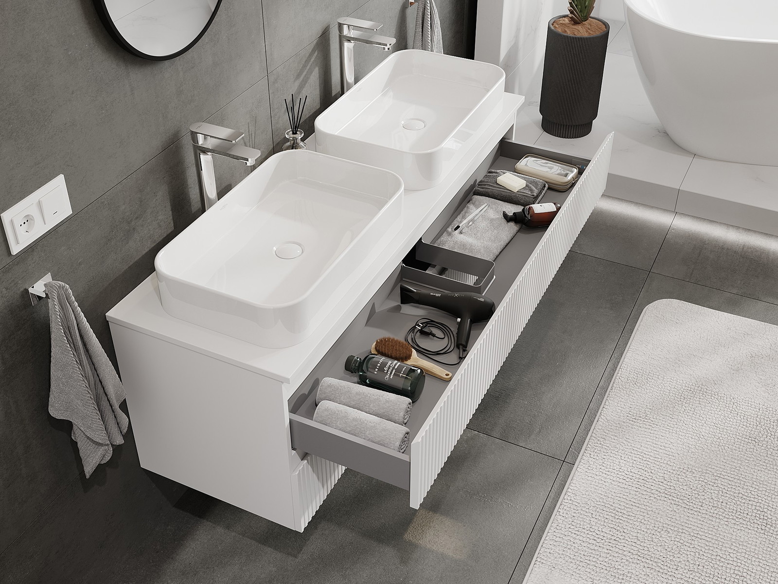 A fiókban lévő kivágás úgy van kialakítva, hogy befogadja a mosdó telepítéseknél szükséges szifont. Ennek köszönhetően a bútor teljesen funkcionálisan felszerelhető anélkül, hogy a fiók terének egy részét fel kellene áldozni a telepítés miatt.