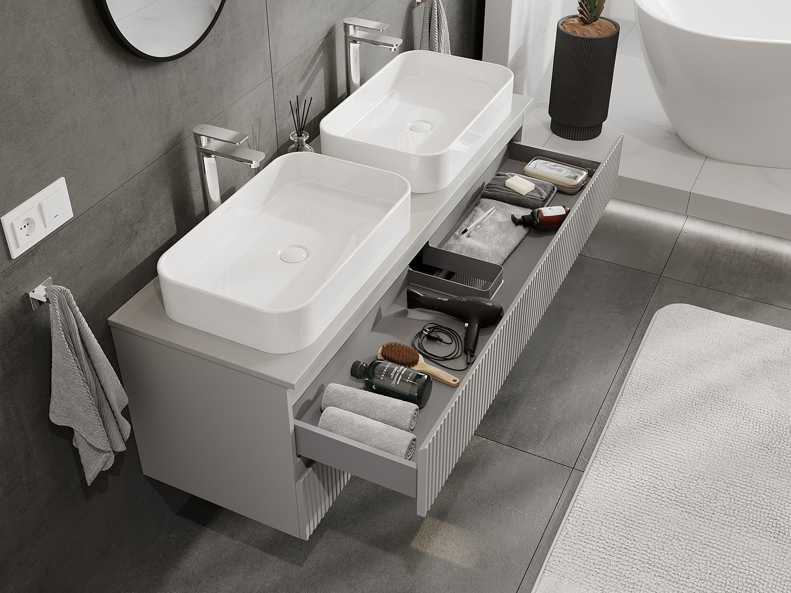 A moduláris fürdőszobabútorainkat különböző színkonfigurációkban lehet kombinálni, lehetővé téve a teljes személyre szabást. Kiválasztható mind az egyes elemek megjelenése, mind pedig funkciói, ami lehetővé teszi a bútorok személyes stílus- és használati preferenciákhoz való igazítását.