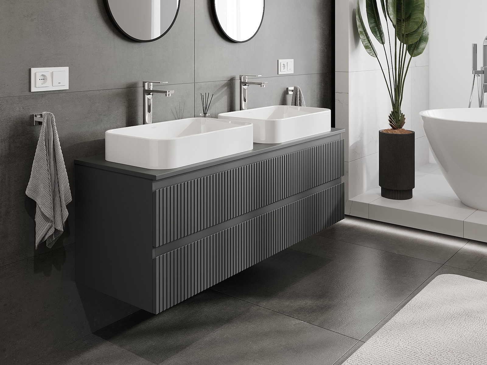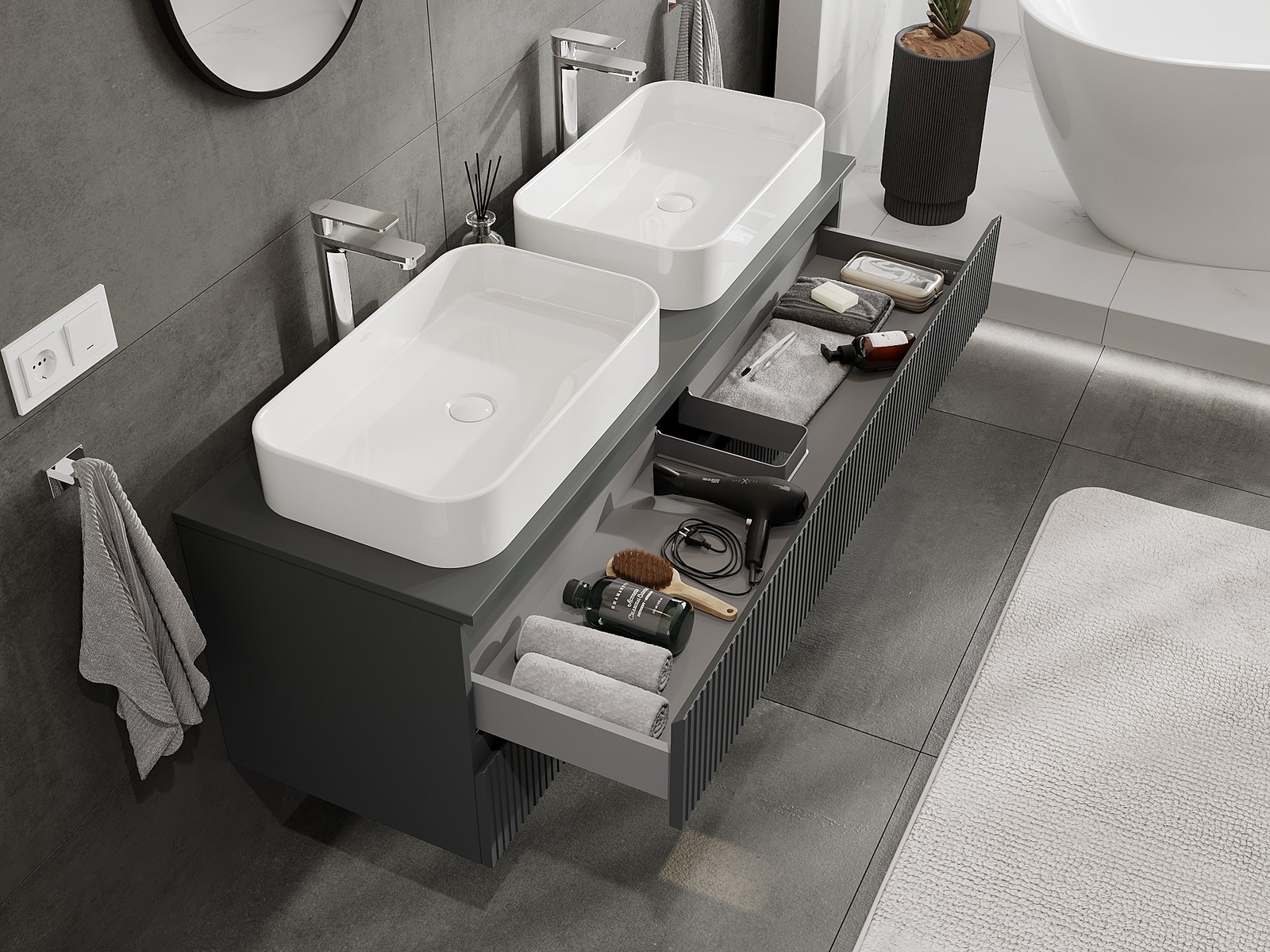 A moduláris fürdőszobabútorainkat különböző színkonfigurációkban lehet kombinálni, lehetővé téve a teljes személyre szabást. Kiválasztható mind az egyes elemek megjelenése, mind pedig funkciói, ami lehetővé teszi a bútorok személyes stílus- és használati preferenciákhoz való igazítását.