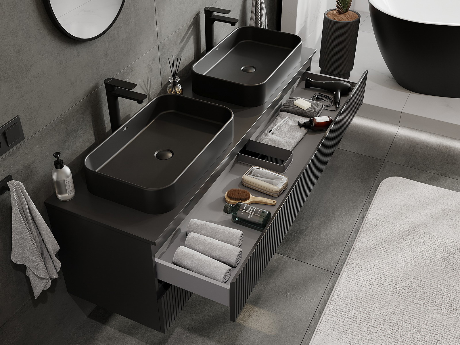 A moduláris fürdőszobabútorainkat különböző színkonfigurációkban lehet kombinálni, lehetővé téve a teljes személyre szabást. Kiválasztható mind az egyes elemek megjelenése, mind pedig funkciói, ami lehetővé teszi a bútorok személyes stílus- és használati preferenciákhoz való igazítását.