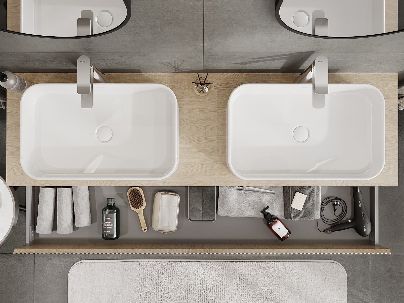 A fiókban lévő kivágás úgy van kialakítva, hogy befogadja a mosdó telepítéseknél szükséges szifont. Ennek köszönhetően a bútor teljesen funkcionálisan felszerelhető anélkül, hogy a fiók terének egy részét fel kellene áldozni a telepítés miatt.