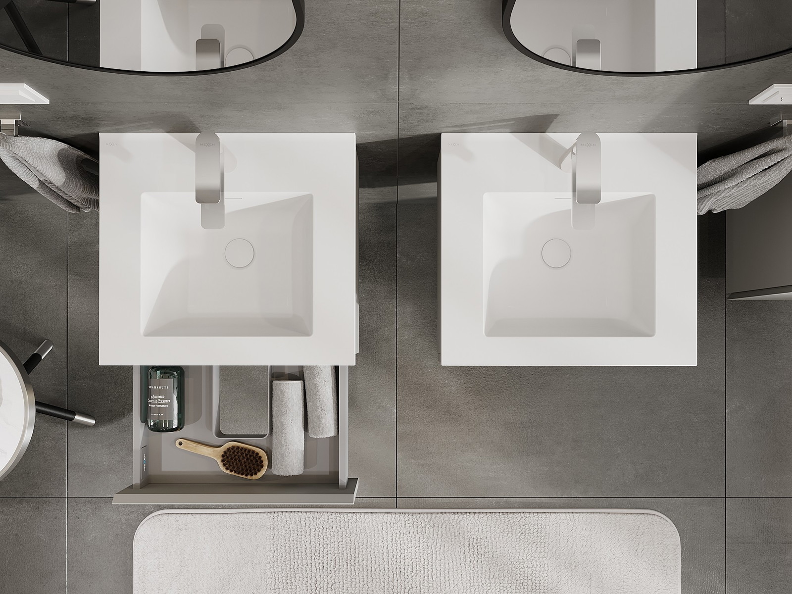 A fiókban lévő kivágás úgy van kialakítva, hogy befogadja a mosdó telepítéseknél szükséges szifont. Ennek köszönhetően a bútor teljesen funkcionálisan felszerelhető anélkül, hogy a fiók terének egy részét fel kellene áldozni a telepítés miatt.