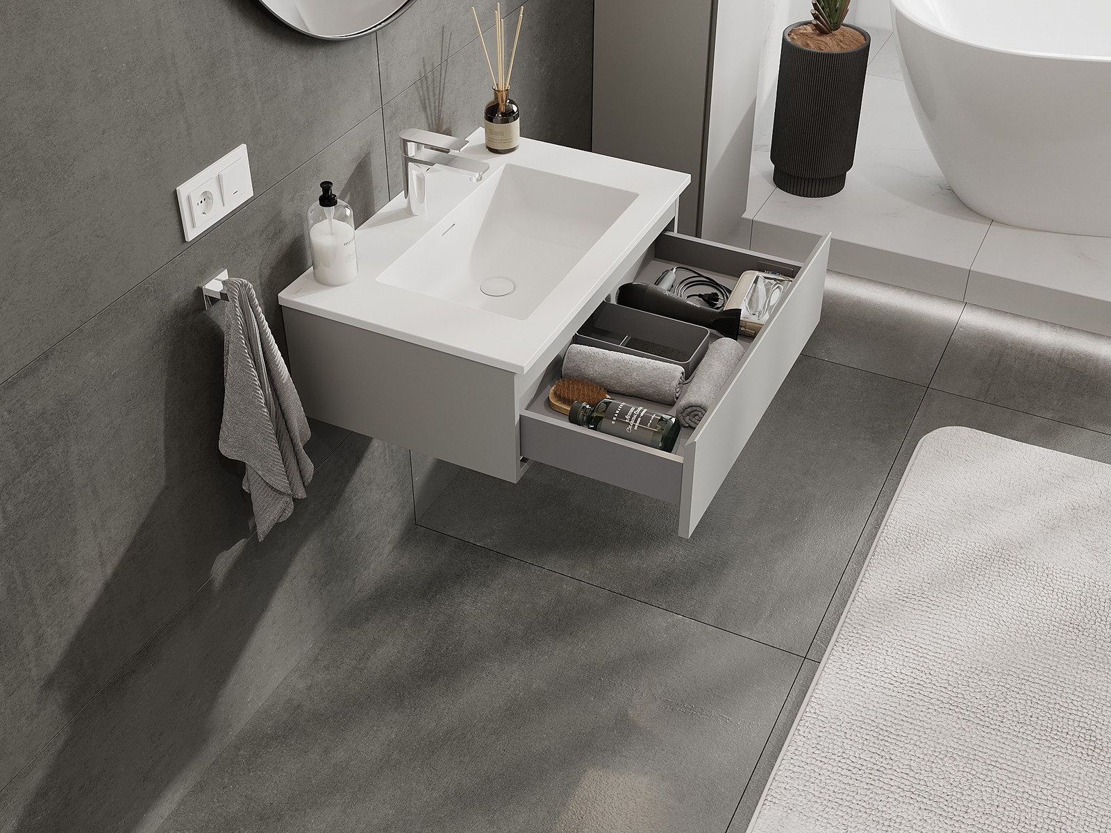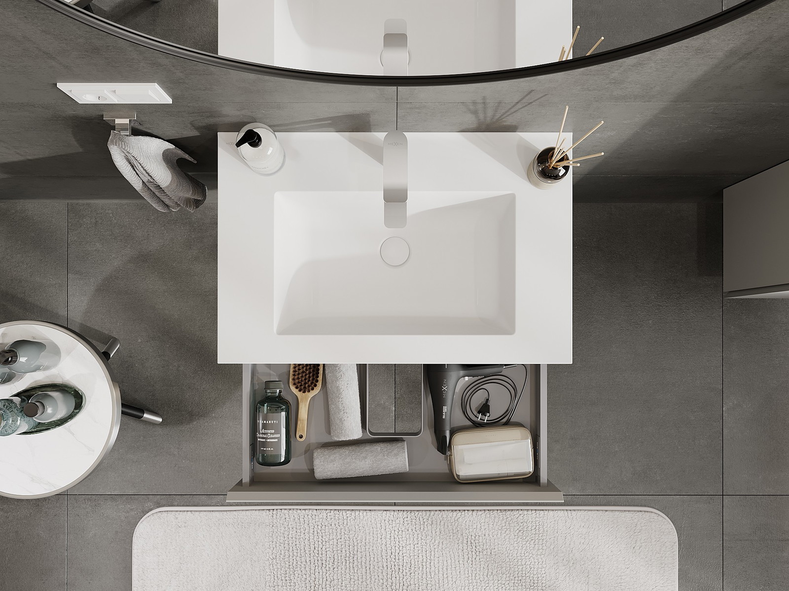 A fiókban lévő kivágás úgy van kialakítva, hogy befogadja a mosdó telepítéseknél szükséges szifont. Ennek köszönhetően a bútor teljesen funkcionálisan felszerelhető anélkül, hogy a fiók terének egy részét fel kellene áldozni a telepítés miatt.