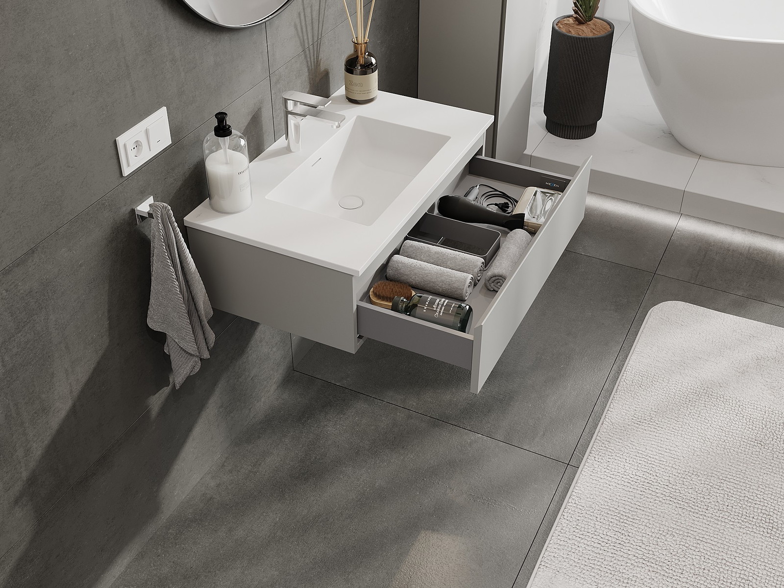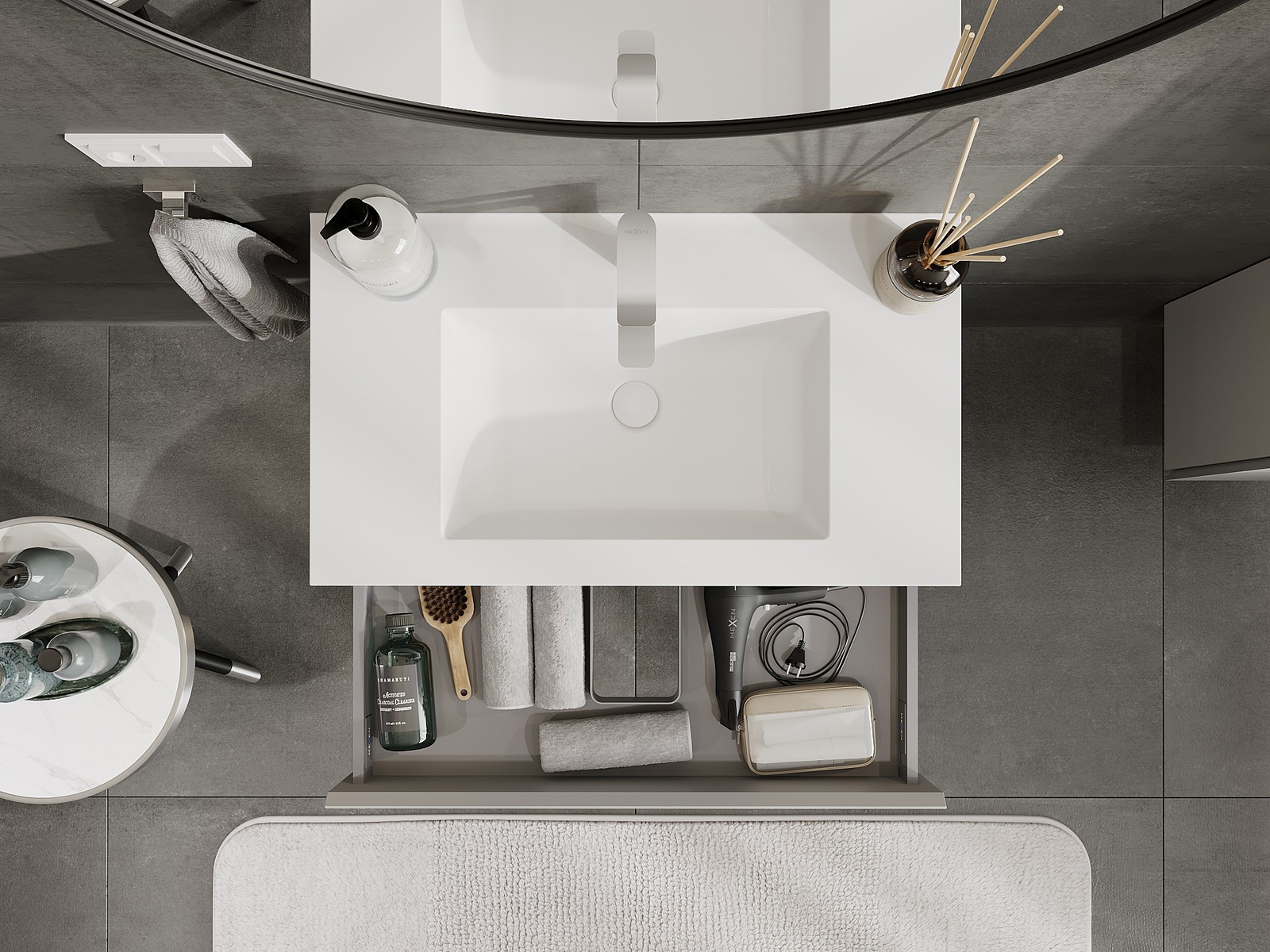 A fiókban lévő kivágás úgy van kialakítva, hogy befogadja a mosdó telepítéseknél szükséges szifont. Ennek köszönhetően a bútor teljesen funkcionálisan felszerelhető anélkül, hogy a fiók terének egy részét fel kellene áldozni a telepítés miatt.