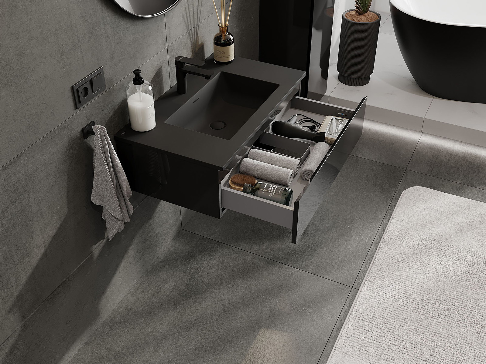 A fiókban lévő kivágás úgy van kialakítva, hogy befogadja a mosdó telepítéseknél szükséges szifont. Ennek köszönhetően a bútor teljesen funkcionálisan felszerelhető anélkül, hogy a fiók terének egy részét fel kellene áldozni a telepítés miatt.