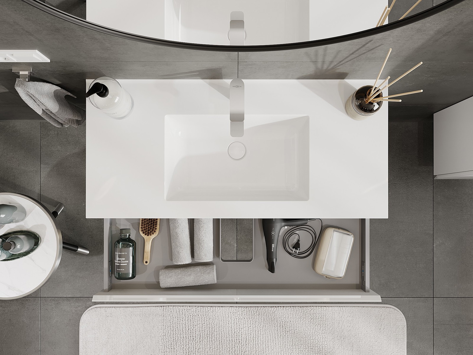A fiókban lévő kivágás úgy van kialakítva, hogy befogadja a mosdó telepítéseknél szükséges szifont. Ennek köszönhetően a bútor teljesen funkcionálisan felszerelhető anélkül, hogy a fiók terének egy részét fel kellene áldozni a telepítés miatt.