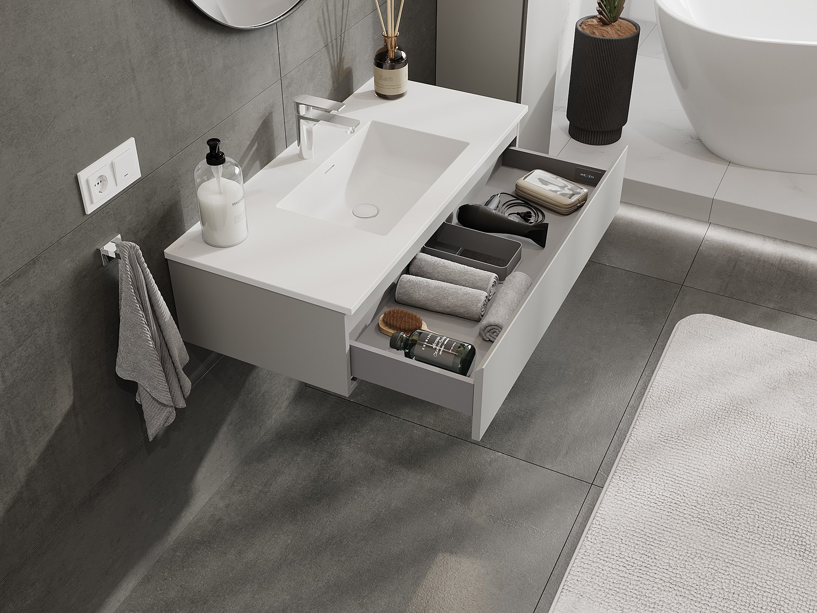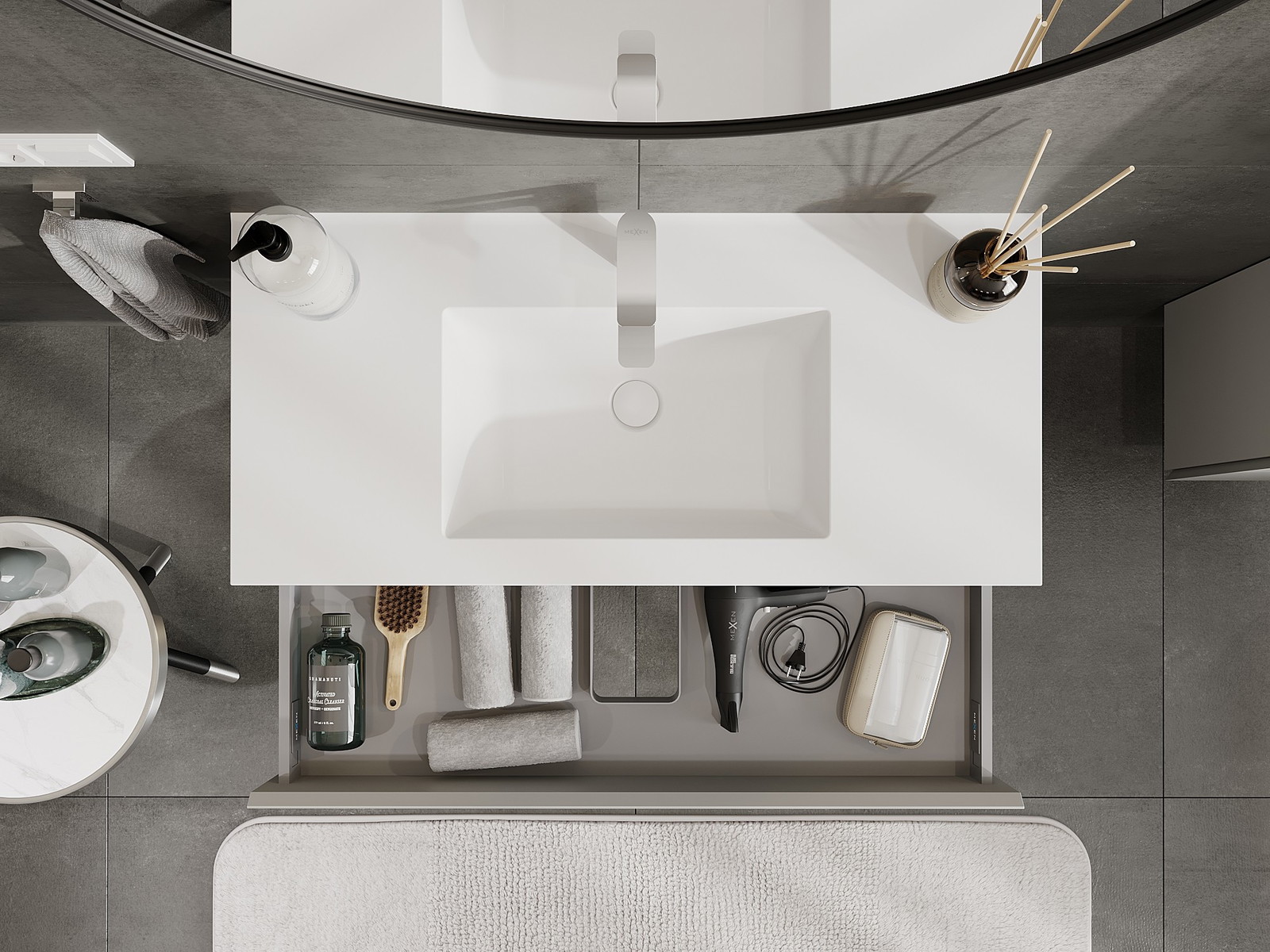 A fiókban lévő kivágás úgy van kialakítva, hogy befogadja a mosdó telepítéseknél szükséges szifont. Ennek köszönhetően a bútor teljesen funkcionálisan felszerelhető anélkül, hogy a fiók terének egy részét fel kellene áldozni a telepítés miatt.