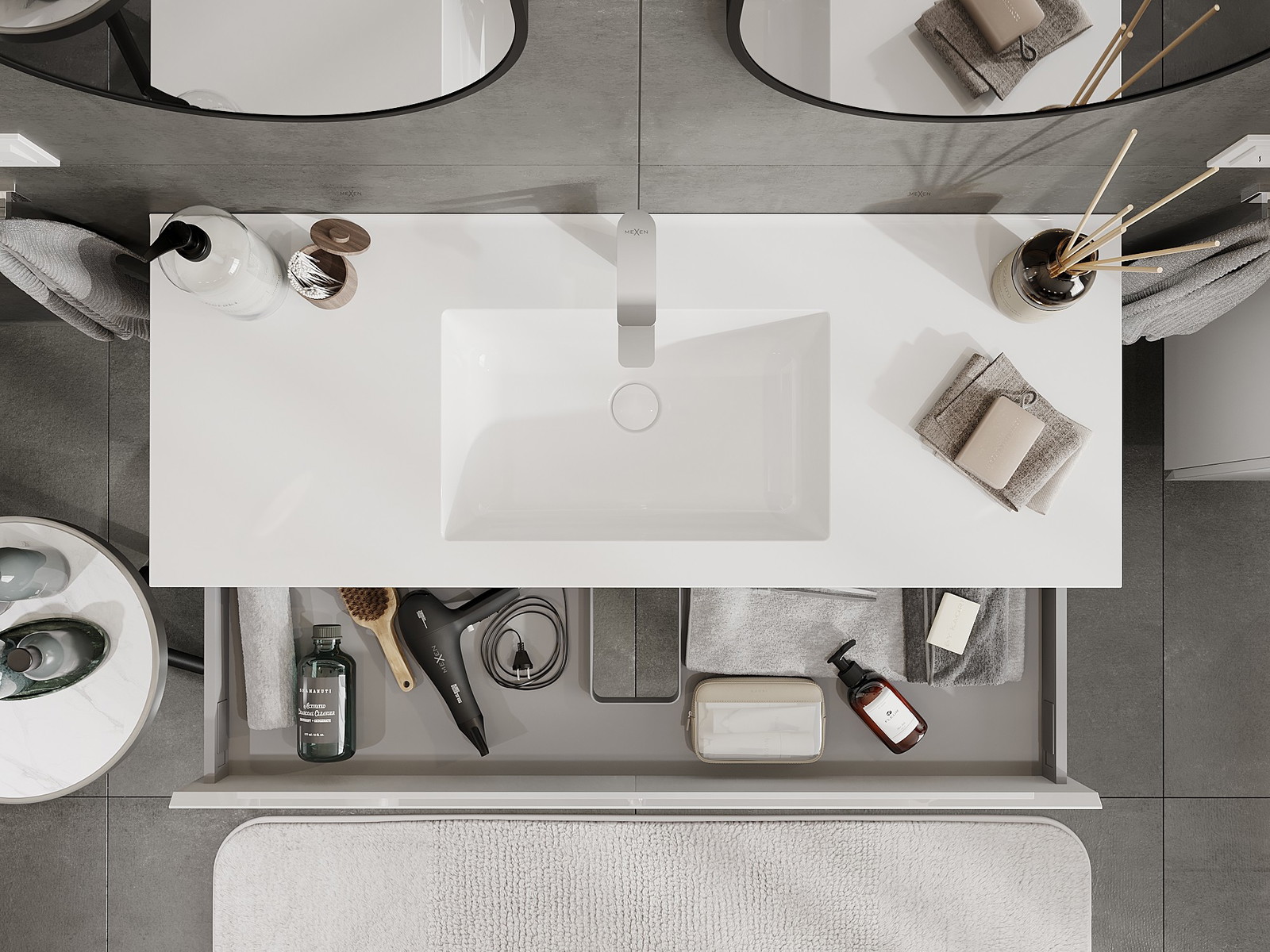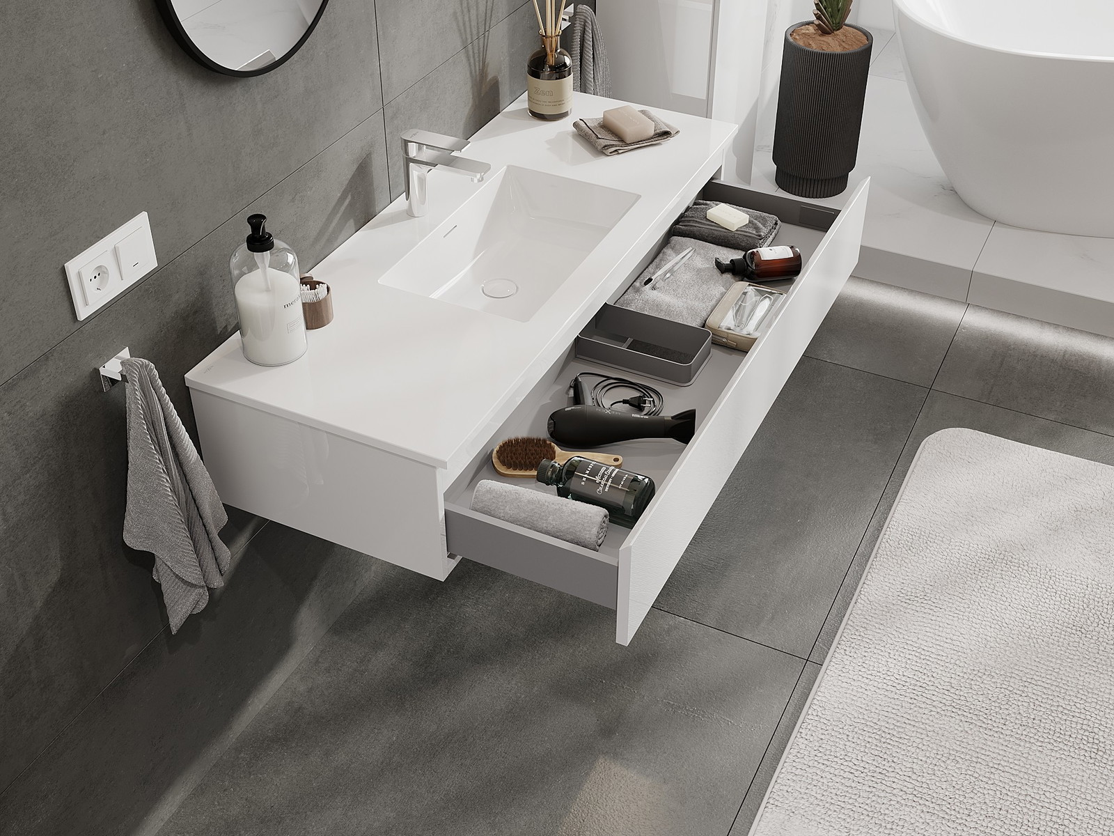 A fiókban lévő kivágás úgy van kialakítva, hogy befogadja a mosdó telepítéseknél szükséges szifont. Ennek köszönhetően a bútor teljesen funkcionálisan felszerelhető anélkül, hogy a fiók terének egy részét fel kellene áldozni a telepítés miatt.