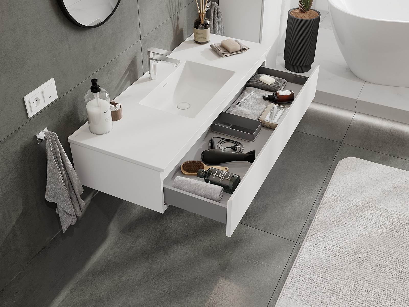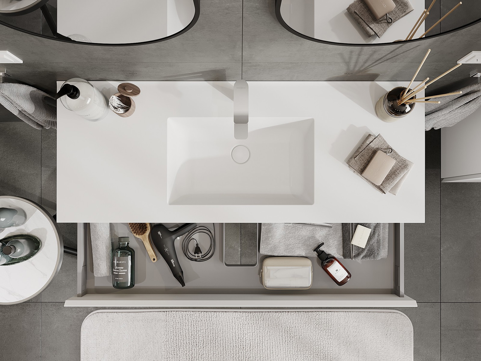 A fiókban lévő kivágás úgy van kialakítva, hogy befogadja a mosdó telepítéseknél szükséges szifont. Ennek köszönhetően a bútor teljesen funkcionálisan felszerelhető anélkül, hogy a fiók terének egy részét fel kellene áldozni a telepítés miatt.