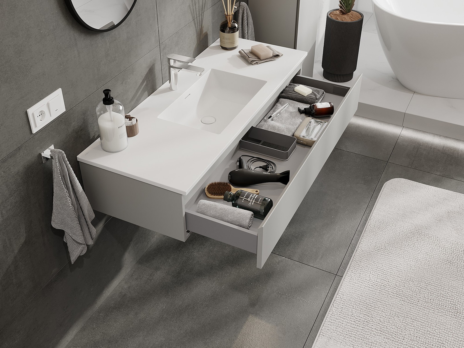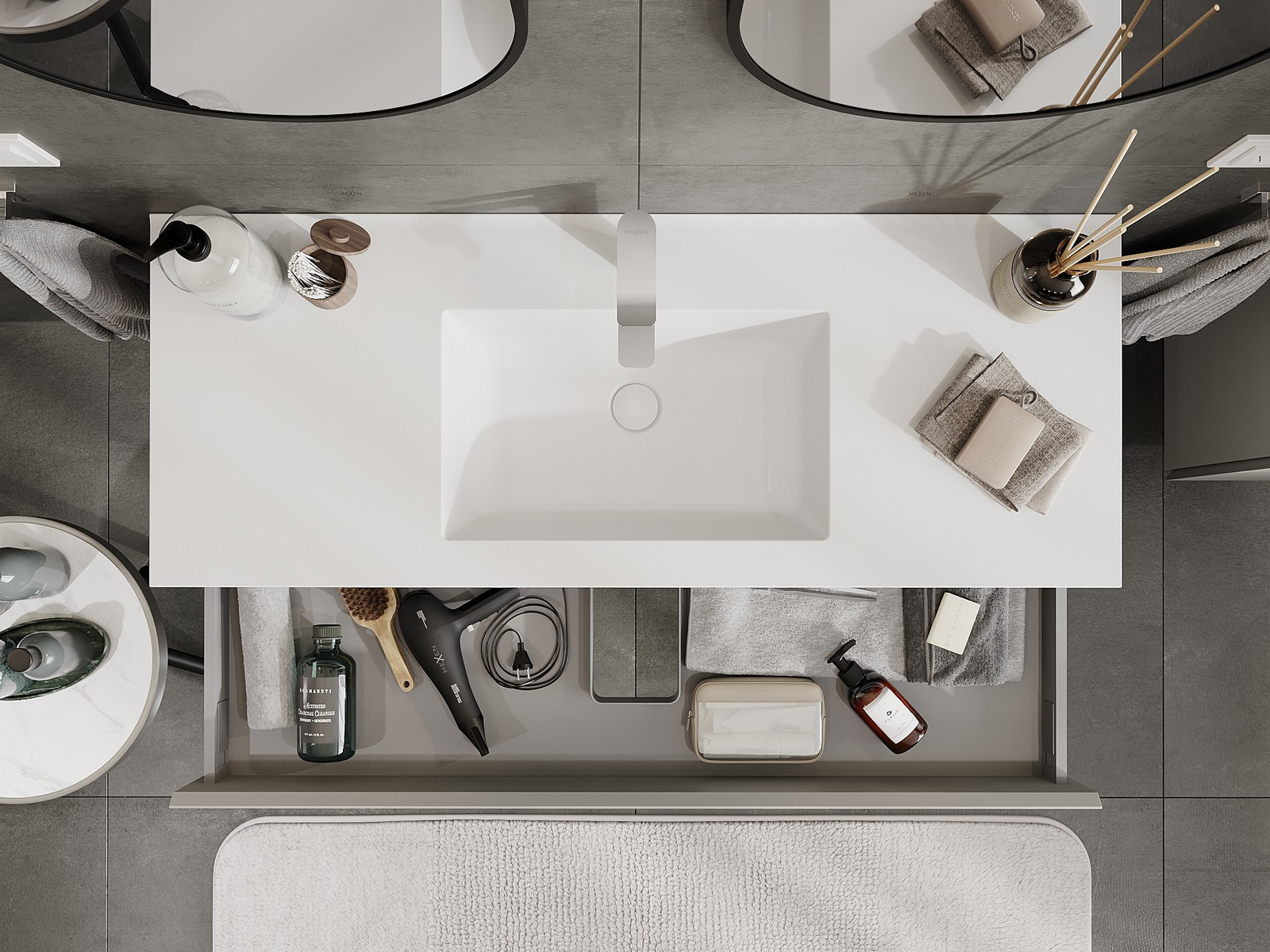 A fiókban lévő kivágás úgy van kialakítva, hogy befogadja a mosdó telepítéseknél szükséges szifont. Ennek köszönhetően a bútor teljesen funkcionálisan felszerelhető anélkül, hogy a fiók terének egy részét fel kellene áldozni a telepítés miatt.
