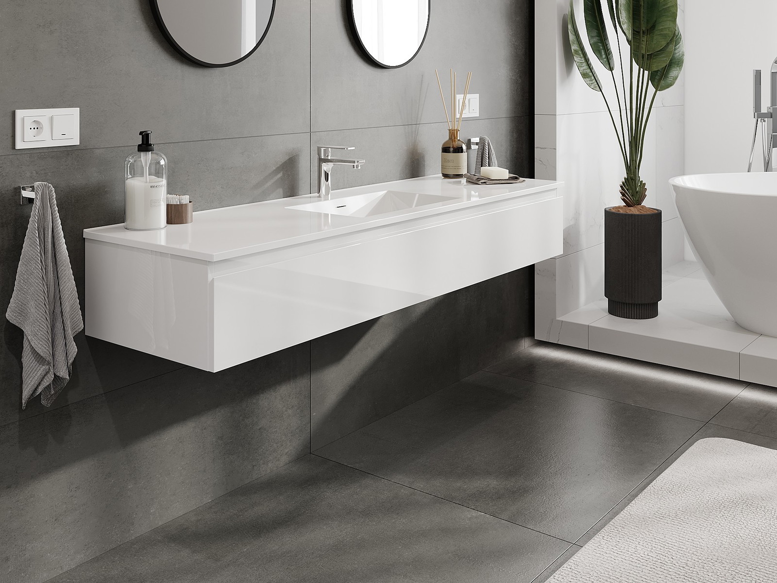 A magas minőségű lakkal bevont lemez kiváló választás a fürdőszobába, elegáns megjelenést biztosít, valamint nagy ellenállást a nedvesség és karcolások hatásának. A magas minőségű lakk védi a munkalap felületét, biztosítva annak hosszú távú tartósságát, esztétikumát és könnyű karbantartását.