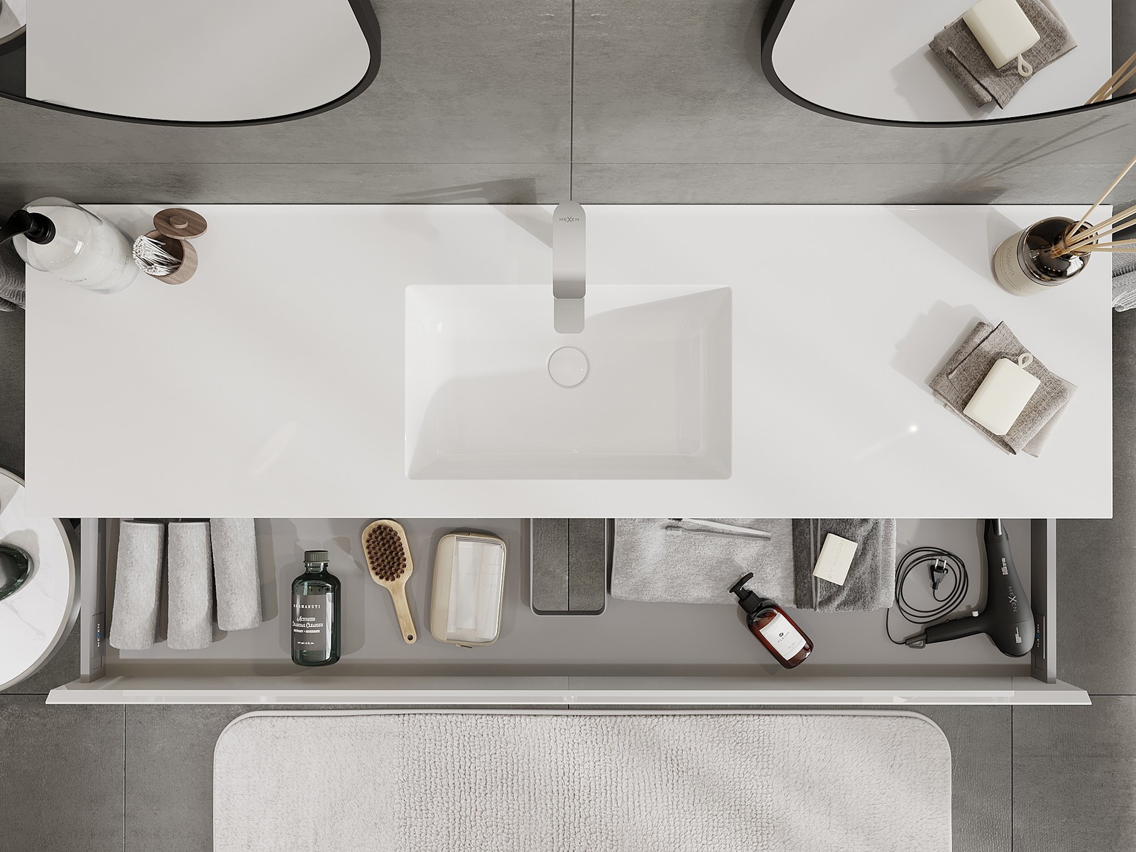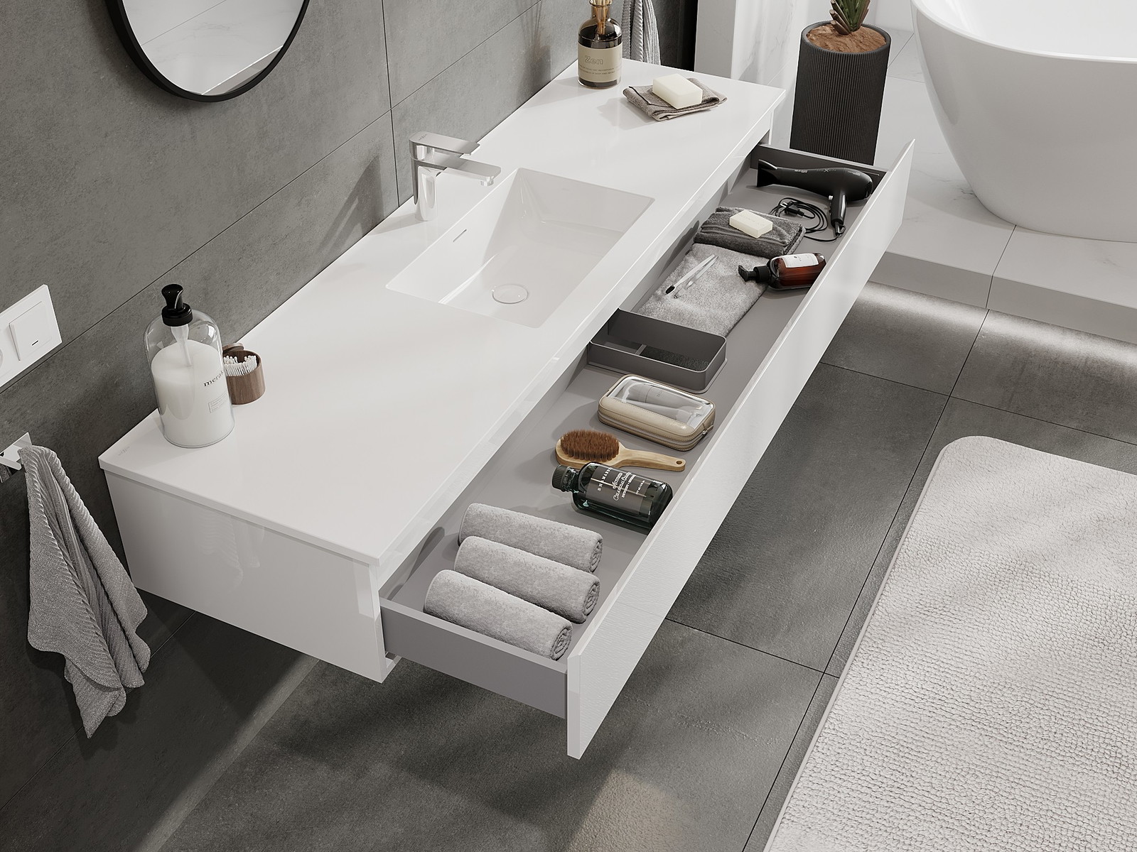 A fiókban lévő kivágás úgy van kialakítva, hogy befogadja a mosdó telepítéseknél szükséges szifont. Ennek köszönhetően a bútor teljesen funkcionálisan felszerelhető anélkül, hogy a fiók terének egy részét fel kellene áldozni a telepítés miatt.