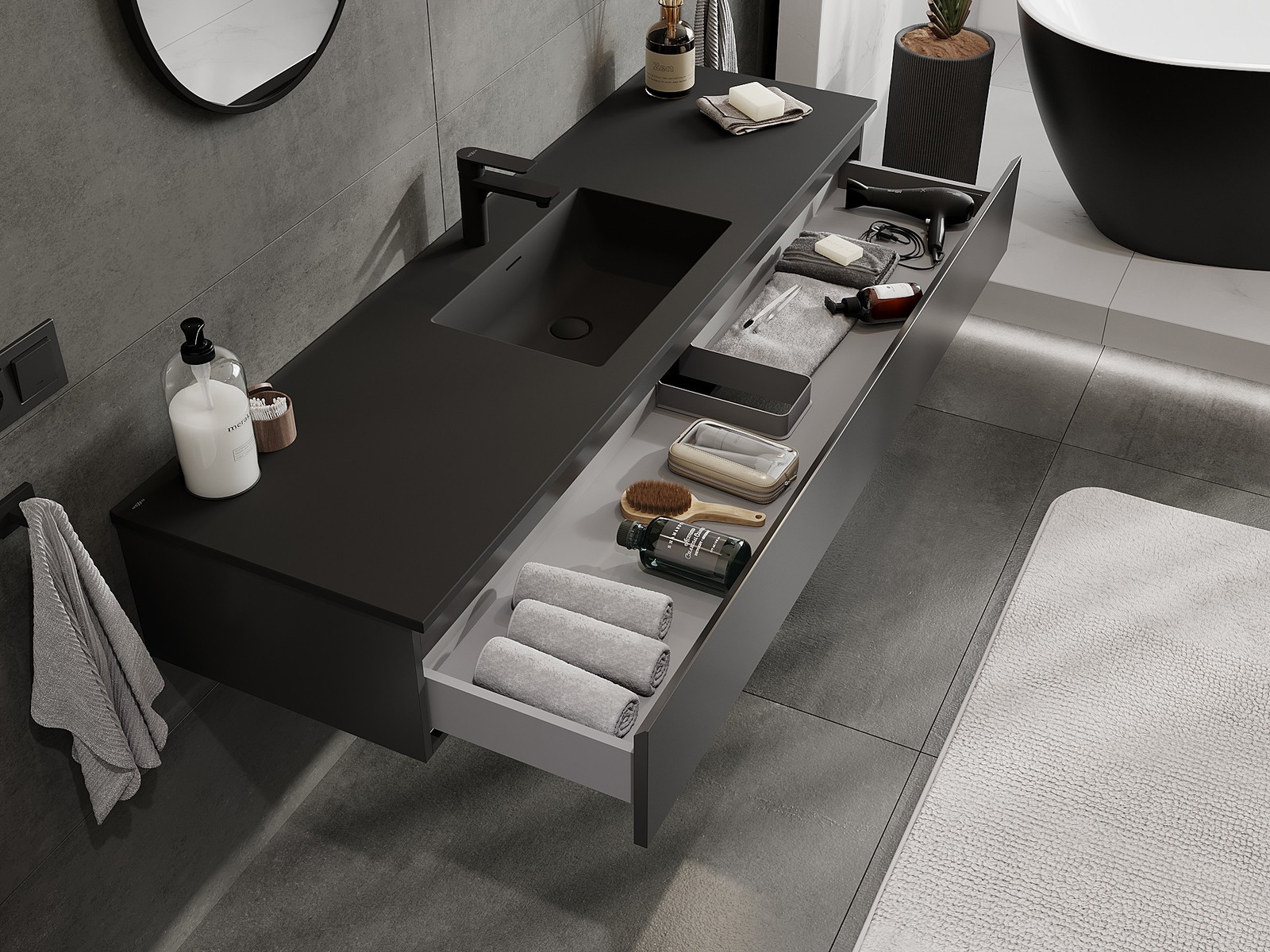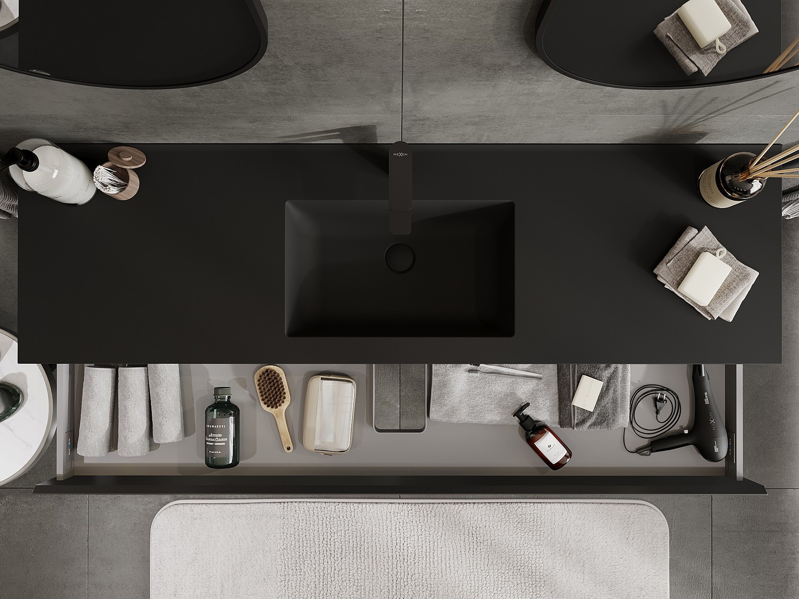 Mexen Orio fürdőszobaszekrény 160 cm mosdóval Otis, 1 fiók, fekete matt - 91A10-16023-1-BF71-W18M71