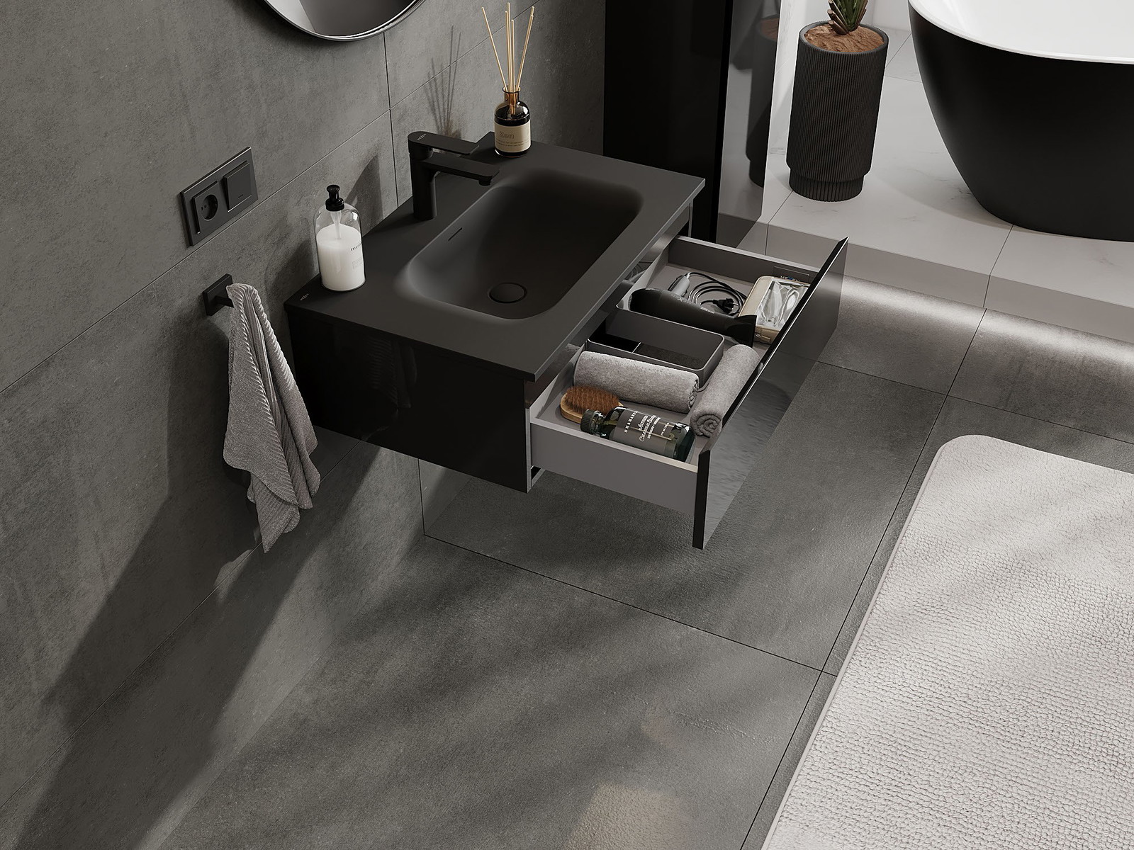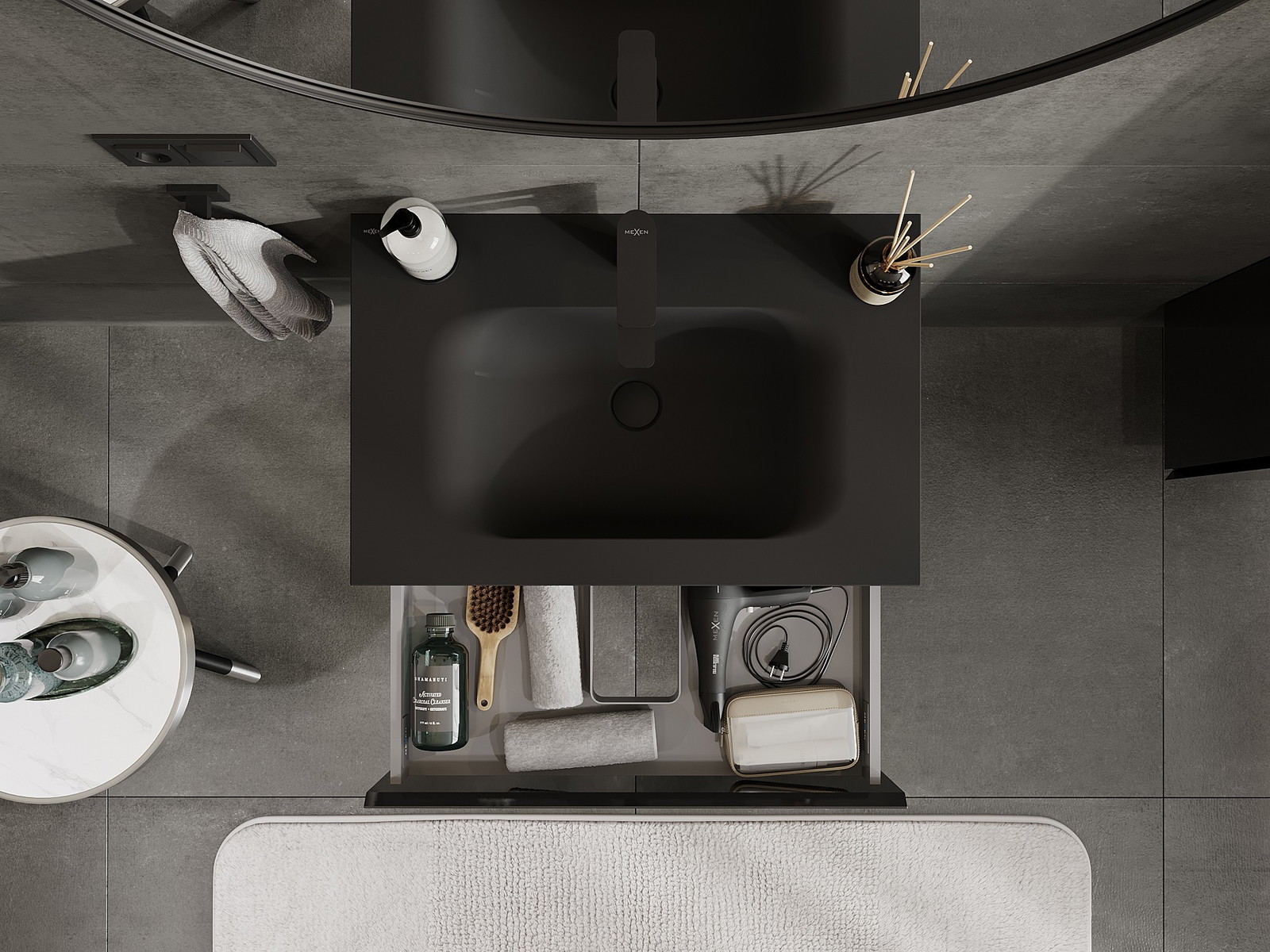 Mexen Orio fürdőszobai szekrény 70 cm mosdóval Vela, 1 fiók, fekete fényes/fekete matt - 91A10-07023-1-BF70-W23M71