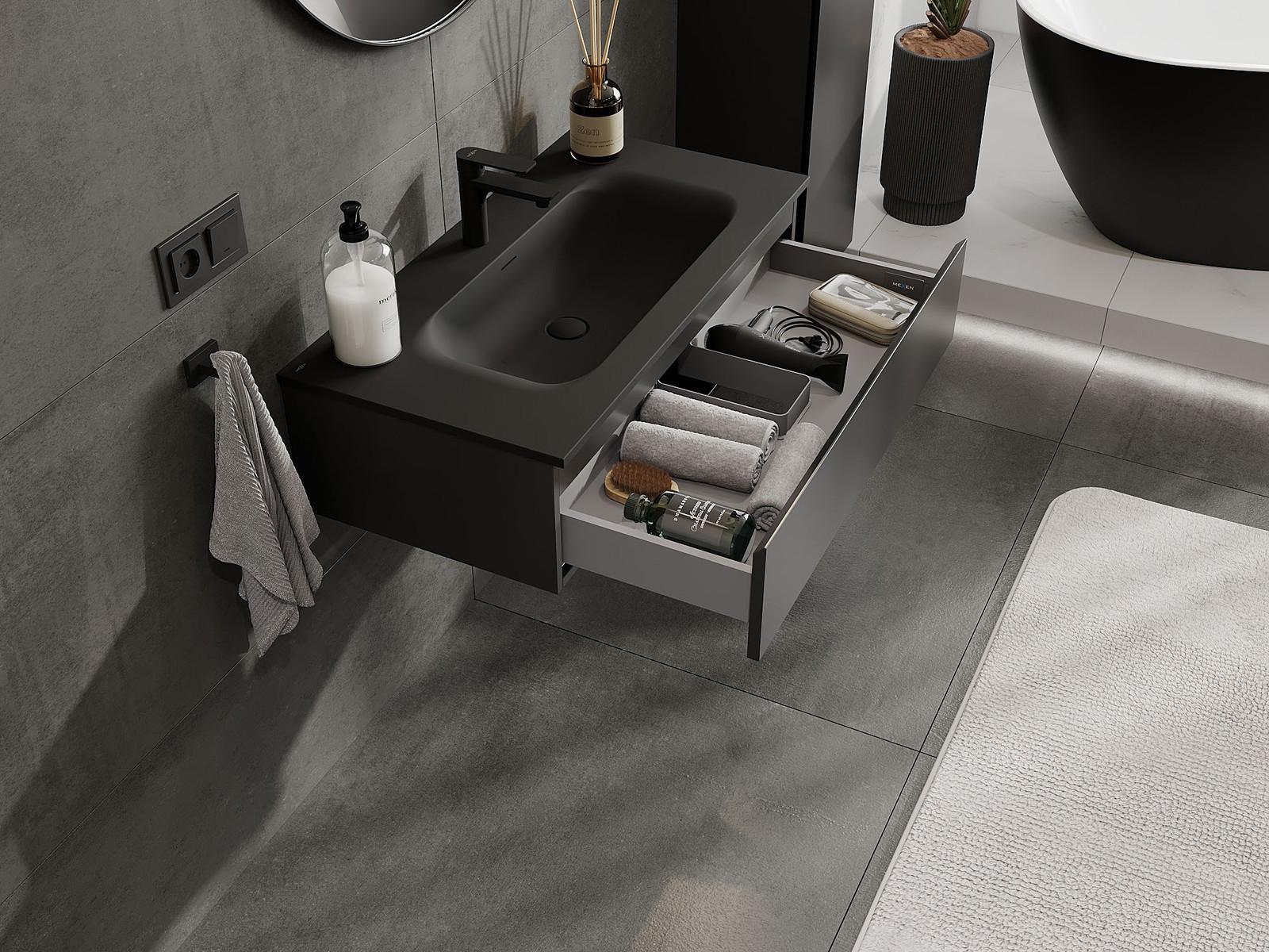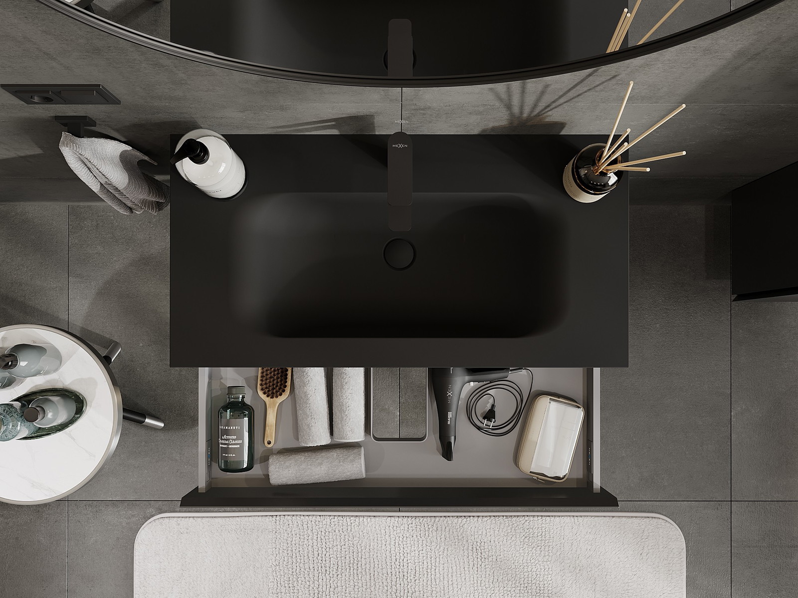 Mexen Orio fürdőszobai szekrény 90 cm mosdóval Vela, 1 fiók, fekete matt - 91A10-09023-1-BF71-W23M71