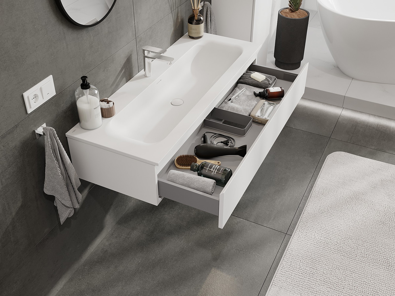 A fiókban lévő kivágás úgy van kialakítva, hogy befogadja a mosdó telepítéseknél szükséges szifont. Ennek köszönhetően a bútor teljesen funkcionálisan felszerelhető anélkül, hogy a fiók terének egy részét fel kellene áldozni a telepítés miatt.