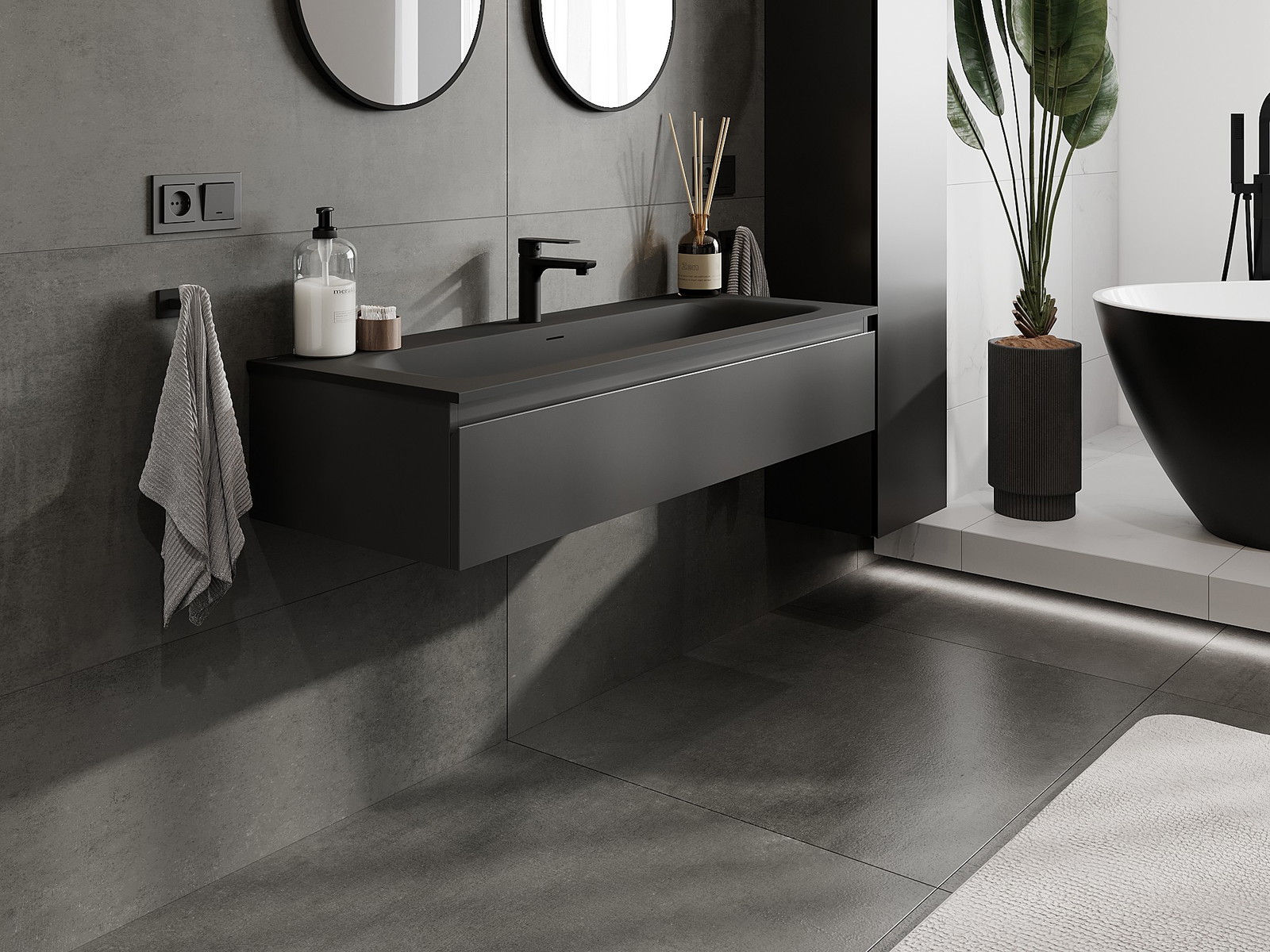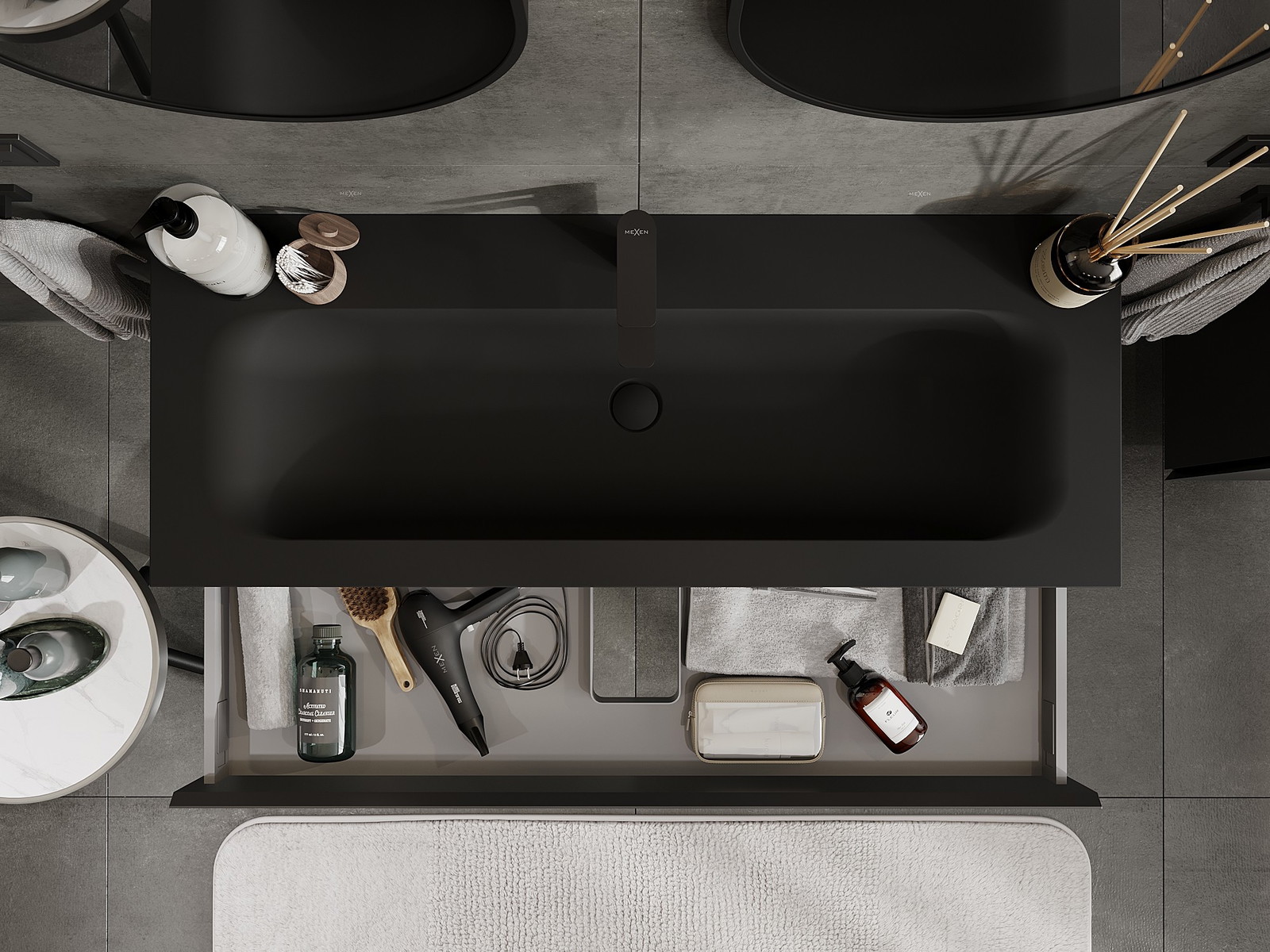Mexen Orio fürdőszobaszekrény 120 cm-es Vela mosdóval, 1 fiók, fekete matt - 91A10-12023-1-BF71-W23M71