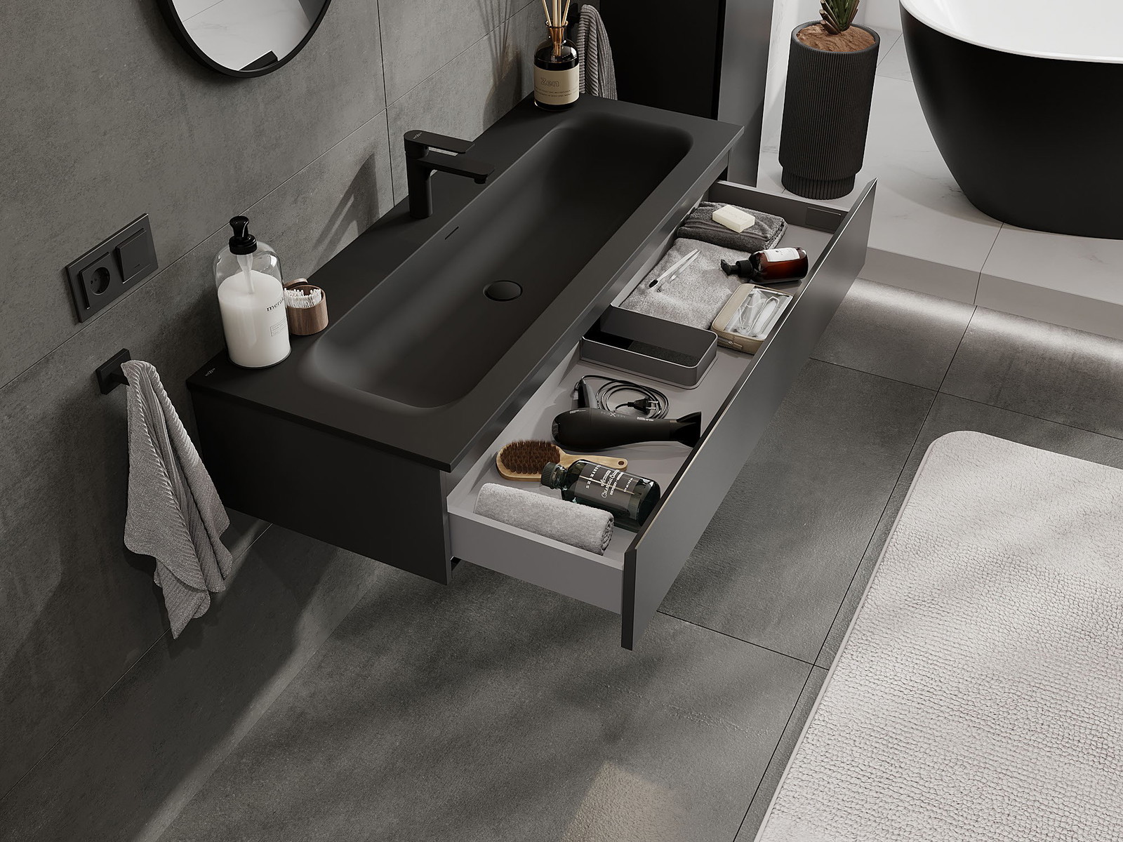 A fiókban lévő kivágás úgy van kialakítva, hogy befogadja a mosdó telepítéseknél szükséges szifont. Ennek köszönhetően a bútor teljesen funkcionálisan felszerelhető anélkül, hogy a fiók terének egy részét fel kellene áldozni a telepítés miatt.