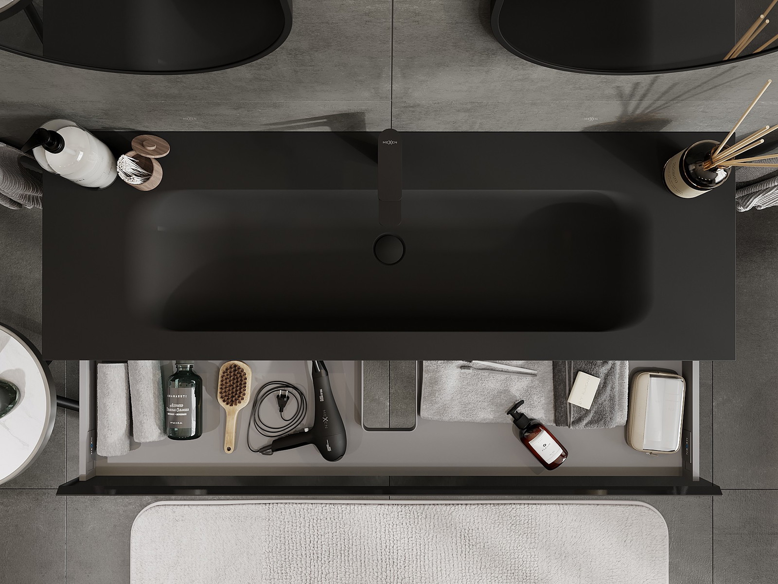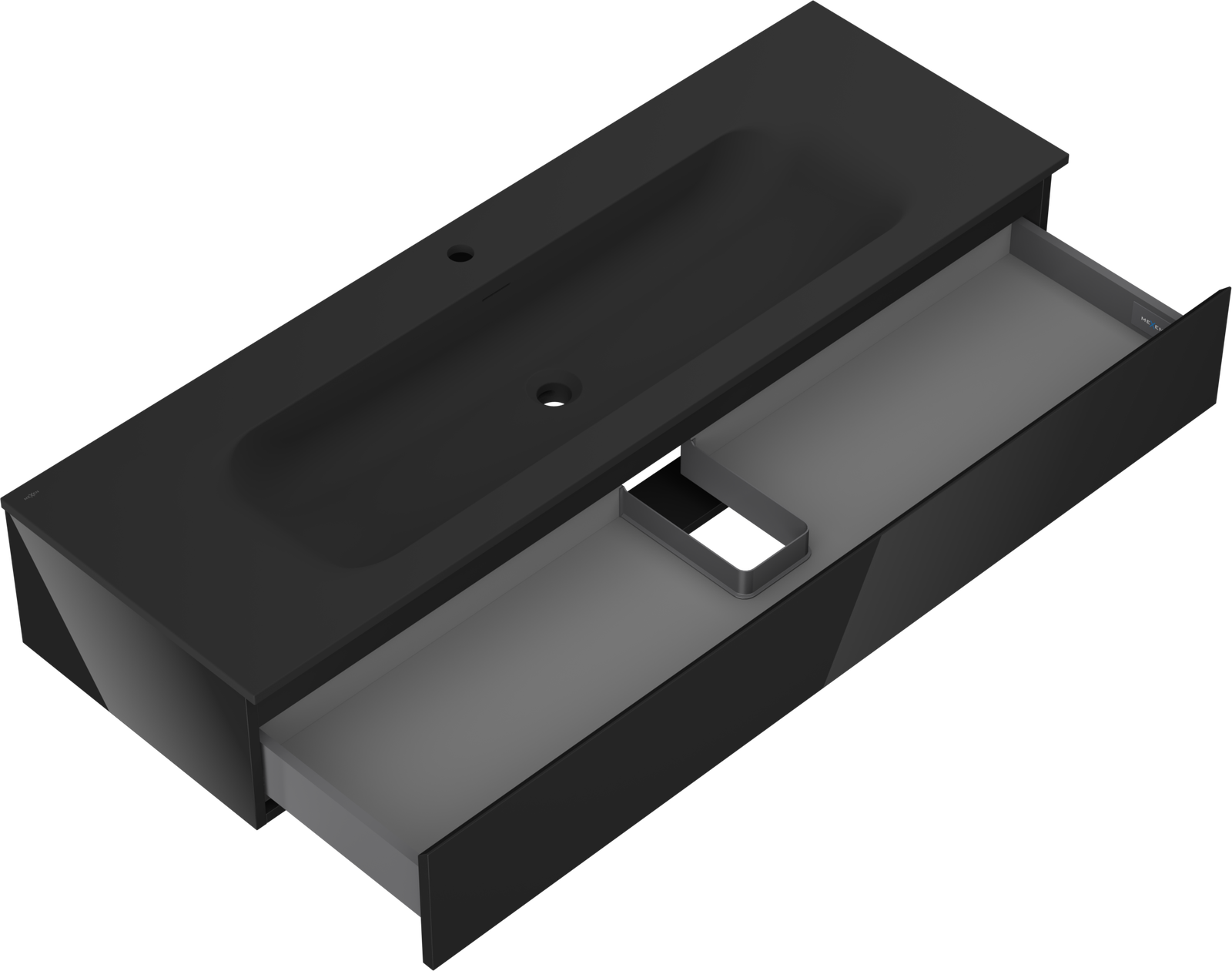 Mexen Orio fürdőszobai szekrény 140 cm Vela mosdóval, 1 fiók, fekete fényes/fekete matt - 91A10-14023-1-BF70-W23M71