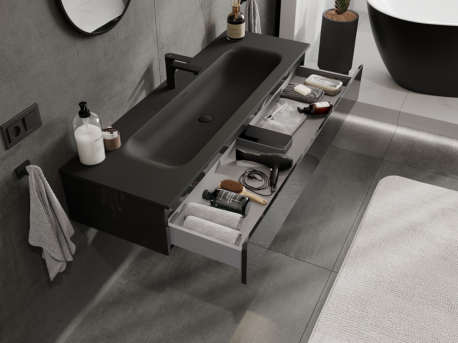 A fiókban lévő kivágás úgy van kialakítva, hogy befogadja a mosdó telepítéseknél szükséges szifont. Ennek köszönhetően a bútor teljesen funkcionálisan felszerelhető anélkül, hogy a fiók terének egy részét fel kellene áldozni a telepítés miatt.