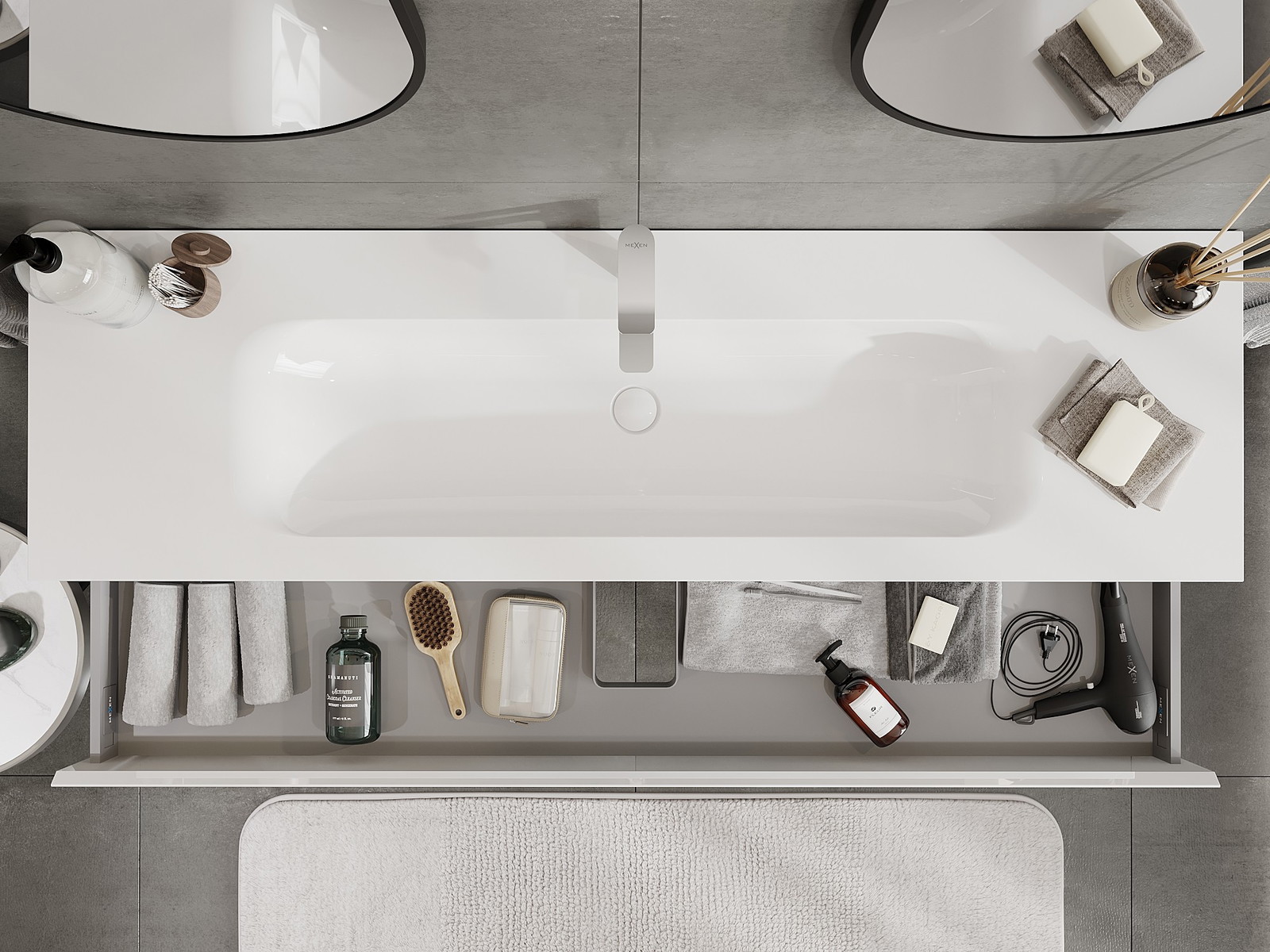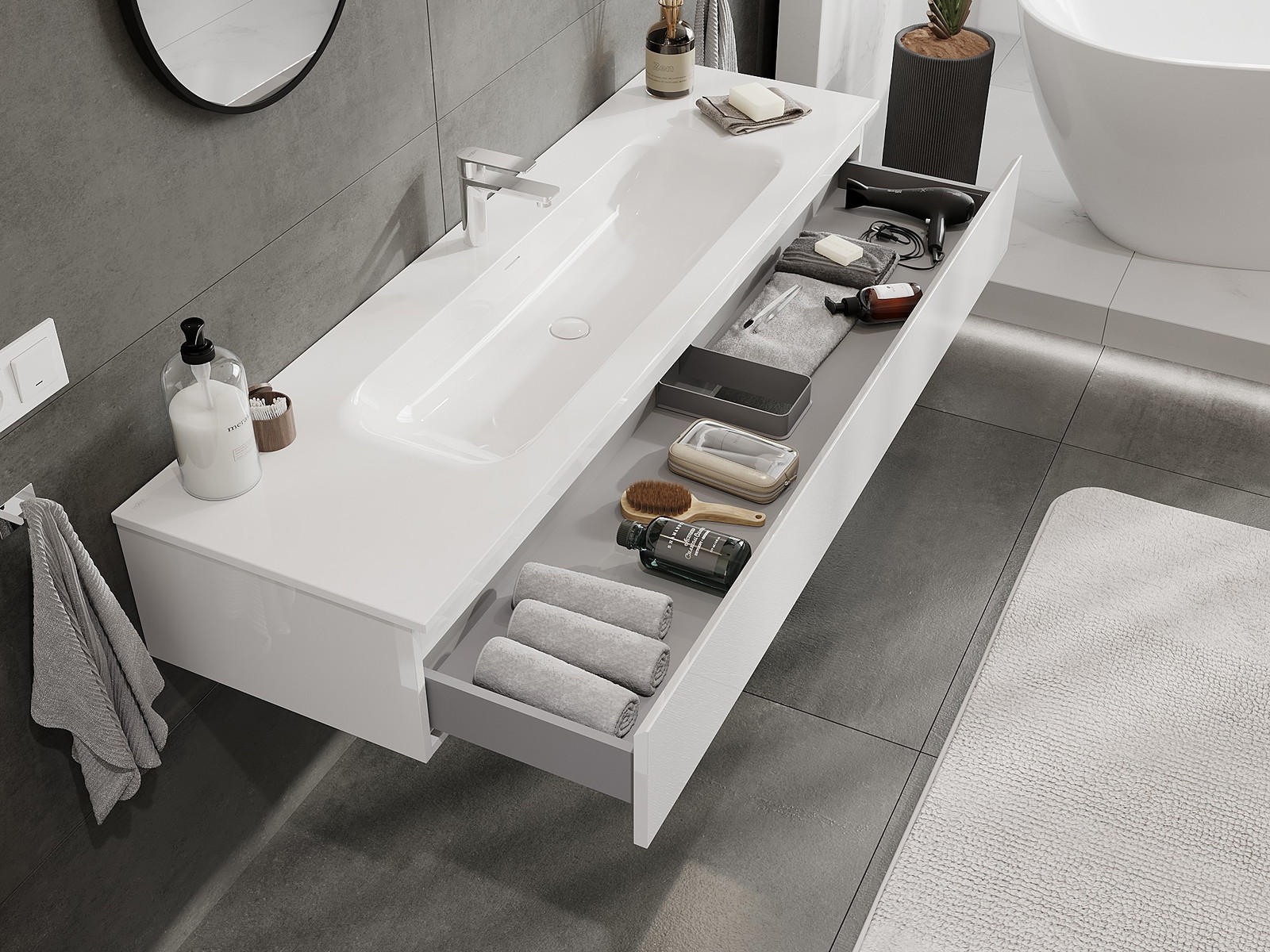 A fiókban lévő kivágás úgy van kialakítva, hogy befogadja a mosdó telepítéseknél szükséges szifont. Ennek köszönhetően a bútor teljesen funkcionálisan felszerelhető anélkül, hogy a fiók terének egy részét fel kellene áldozni a telepítés miatt.