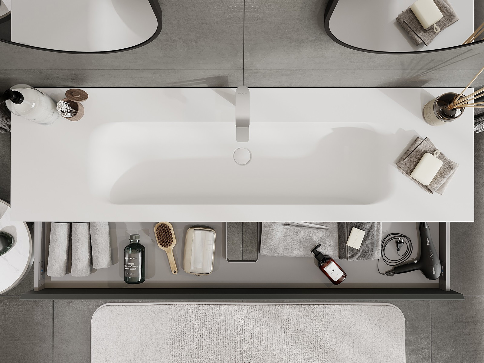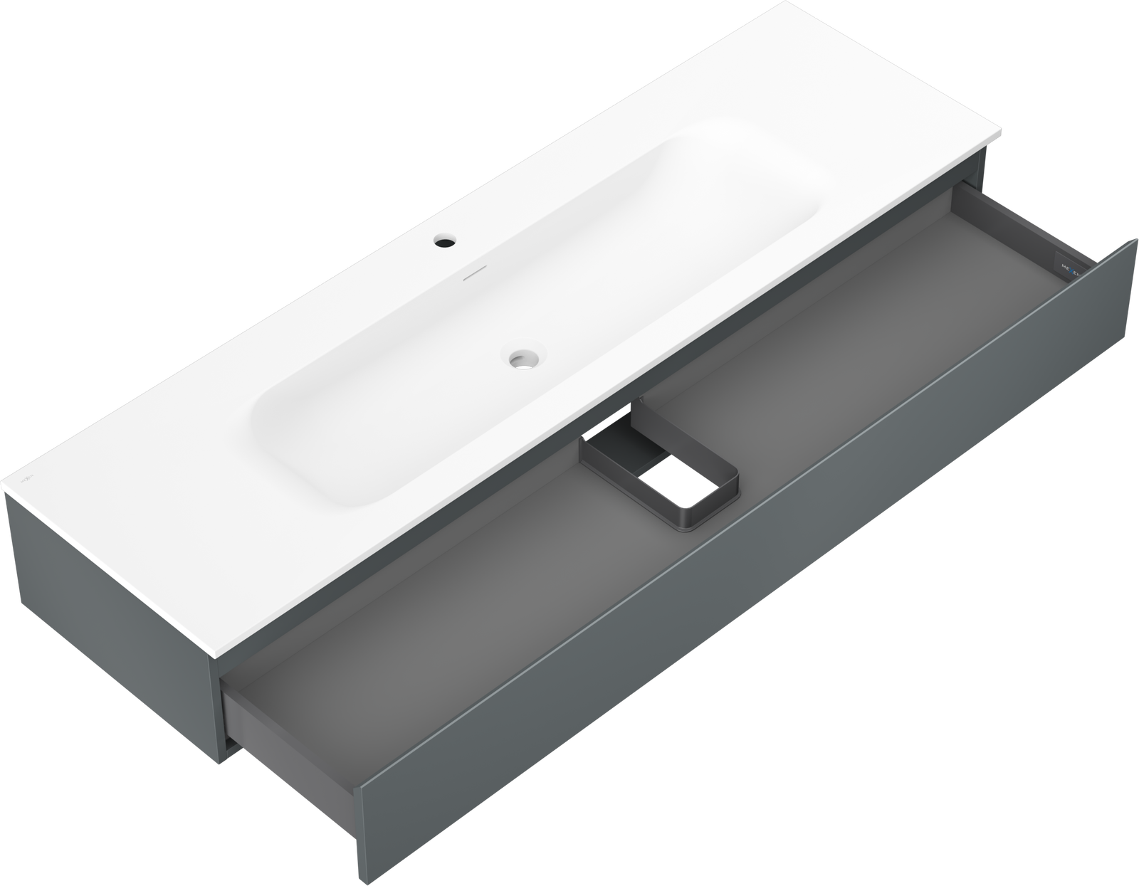 A fiókban lévő kivágás úgy van kialakítva, hogy befogadja a mosdó telepítéseknél szükséges szifont. Ennek köszönhetően a bútor teljesen funkcionálisan felszerelhető anélkül, hogy a fiók terének egy részét fel kellene áldozni a telepítés miatt.