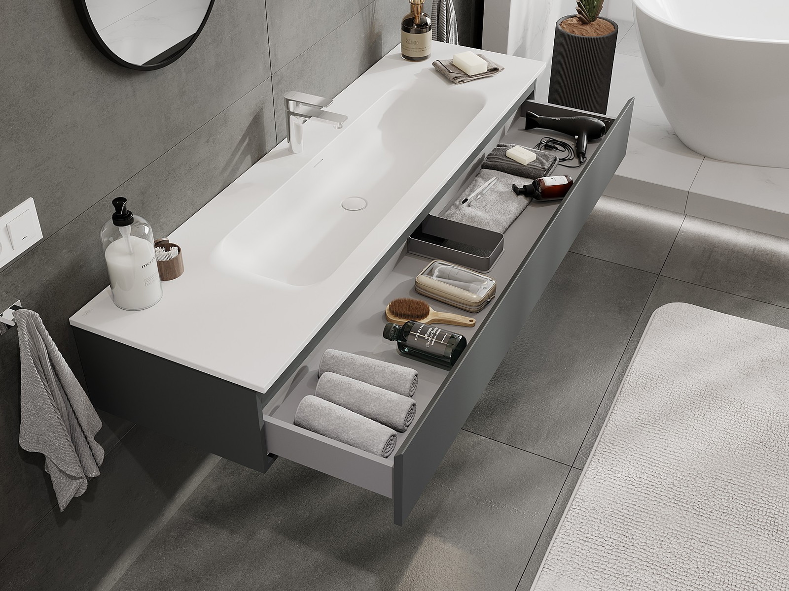 Mexen Orio 160 cm-es fürdőszobai szekrény Vela mosdóval, 1 fiók, grafit matt/fehér matt - 91A10-16023-1-BF66-W23M01