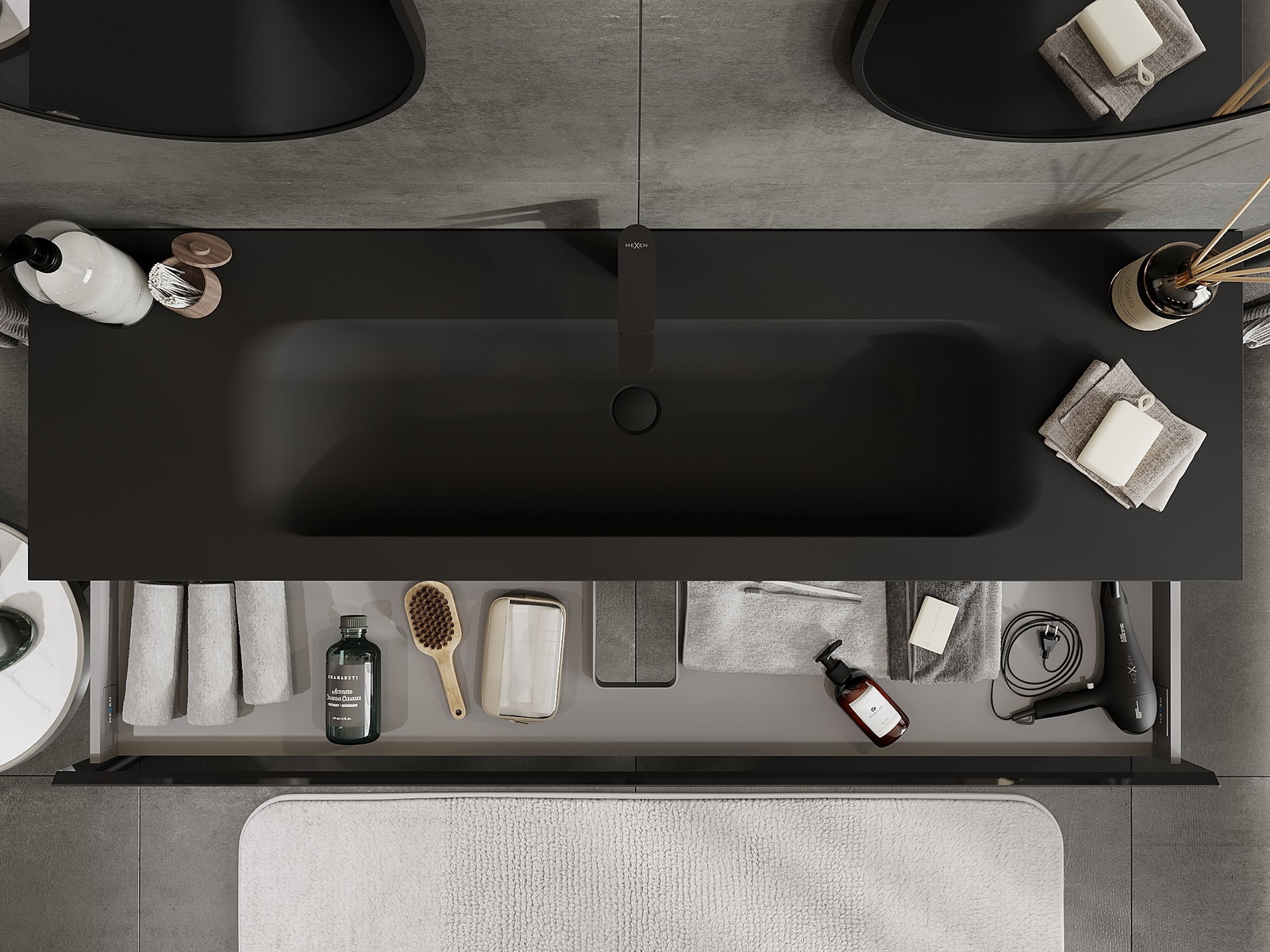 Mexen Orio fürdőszobai szekrény 160 cm-es Vela mosdóval, 1 fiók, fekete fényes/fekete matt - 91A10-16023-1-BF70-W23M71