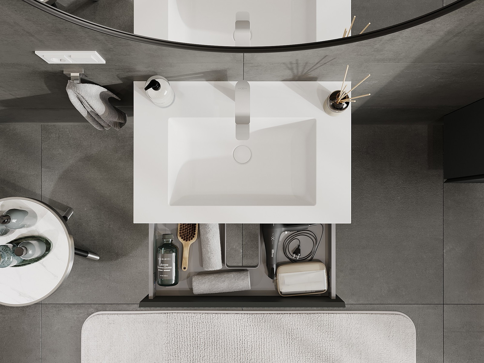 A fiókban lévő kivágás úgy van kialakítva, hogy befogadja a mosdó telepítéseknél szükséges szifont. Ennek köszönhetően a bútor teljesen funkcionálisan felszerelhető anélkül, hogy a fiók terének egy részét fel kellene áldozni a telepítés miatt.