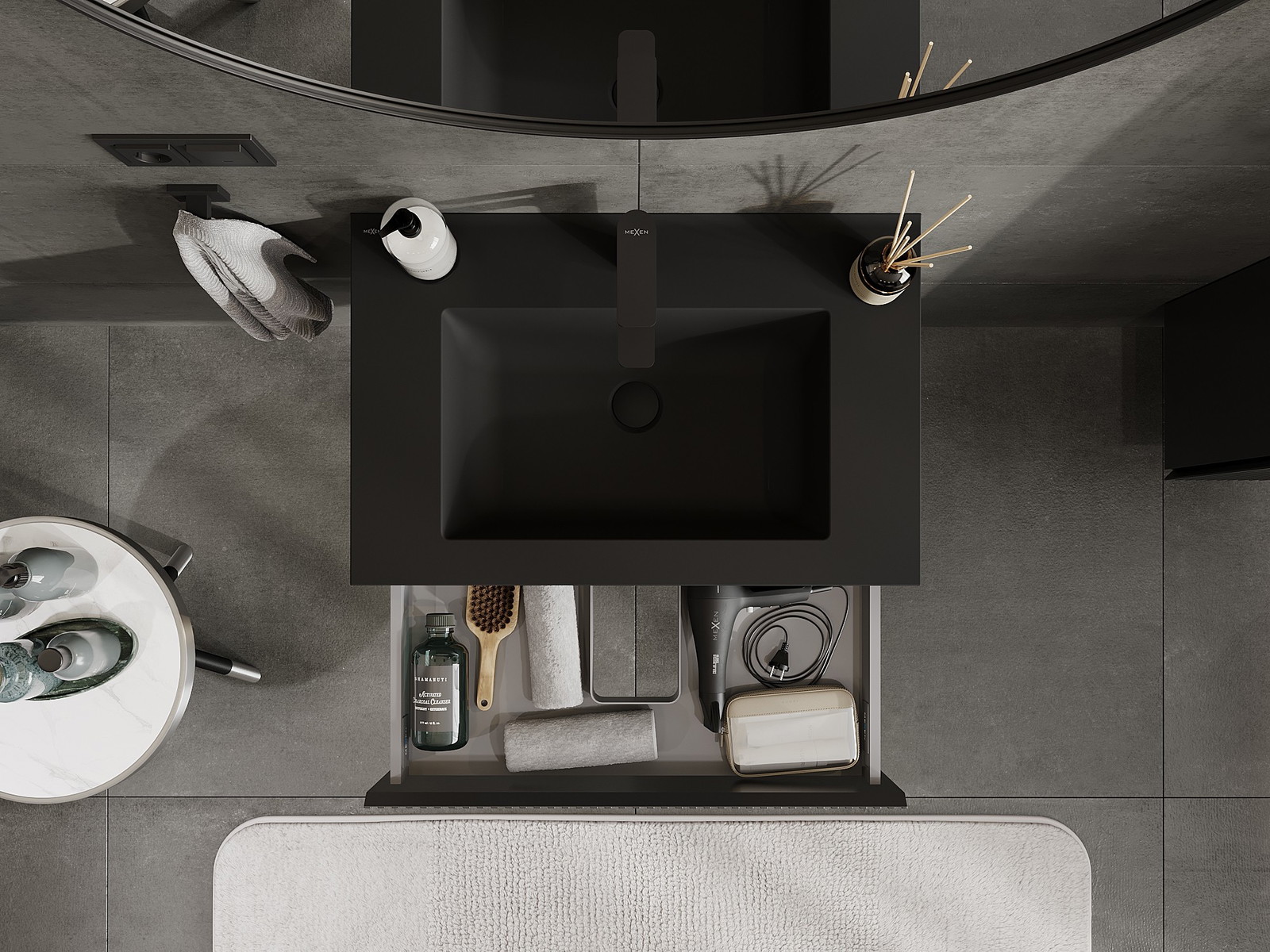 Mexen Rivel 70 cm-es fürdőszobaszekrény Otis mosdóval, 1 fiók, bordázott, fekete matt - 91A20-07023-1-BF71-W18M71
