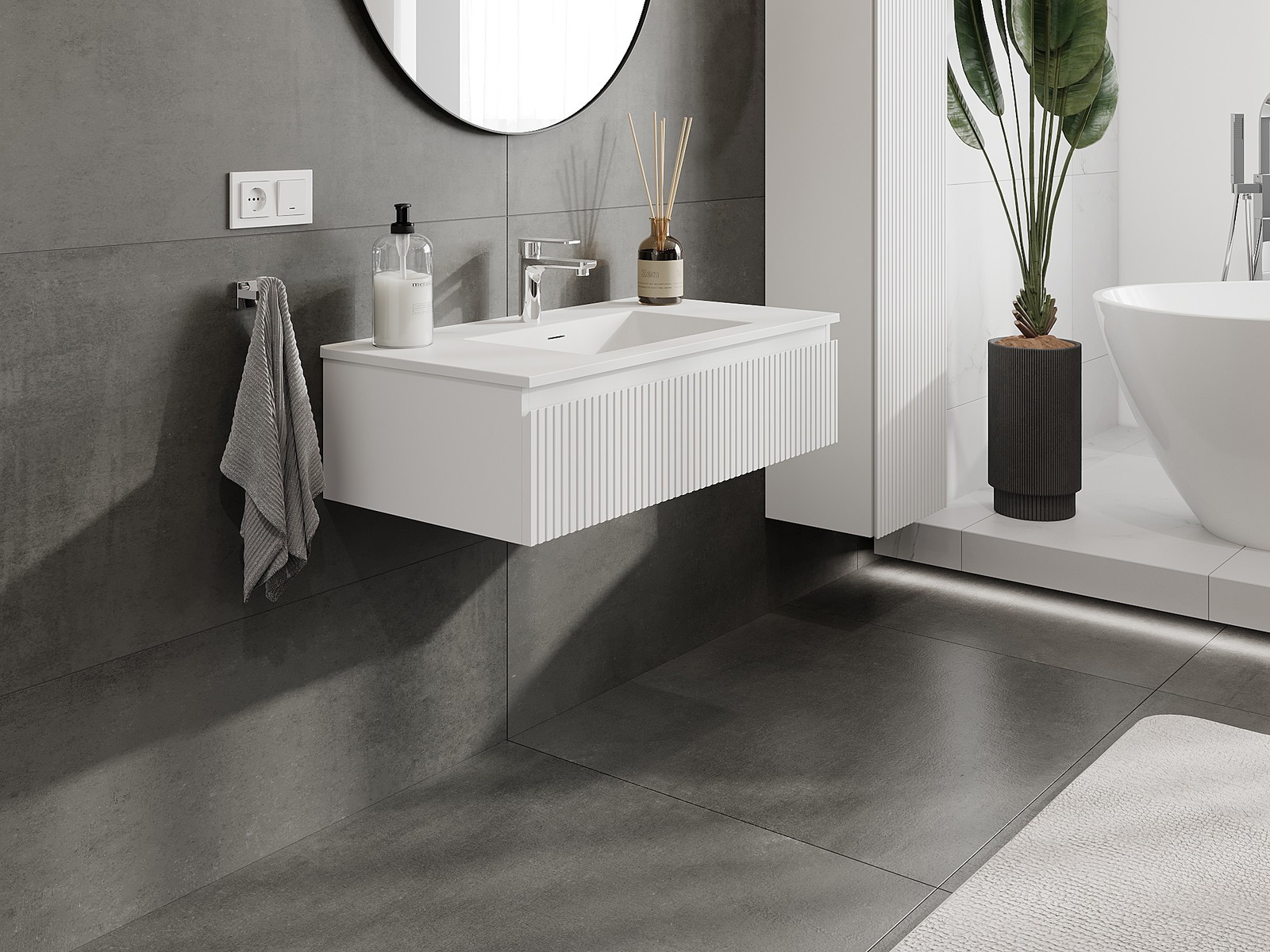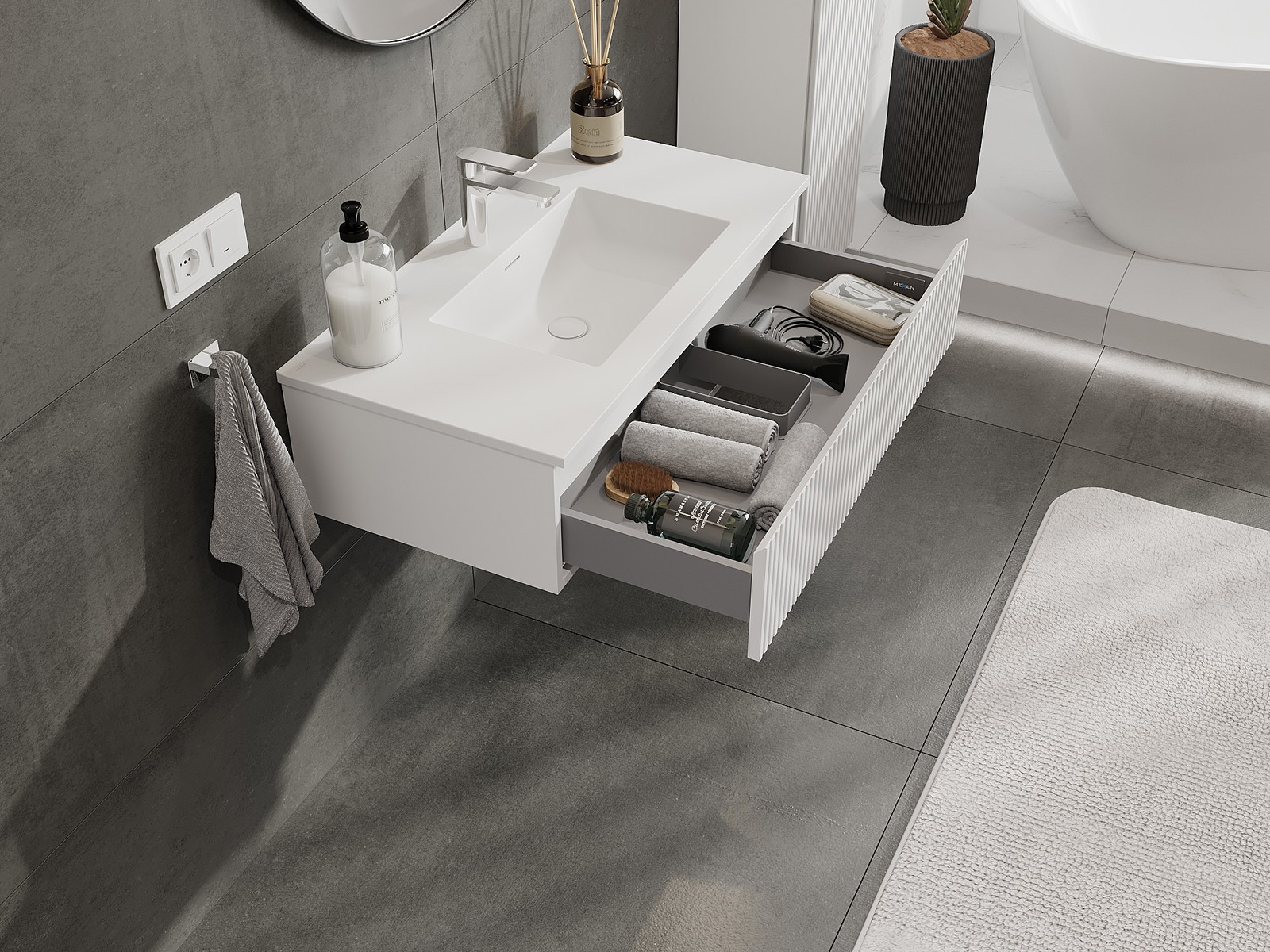 Mexen Rivel 90 cm-es fürdőszobai szekrény Otis mosdóval, 1 fiók, bordázott, fehér matt - 91A20-09023-1-BF01-W18M01
