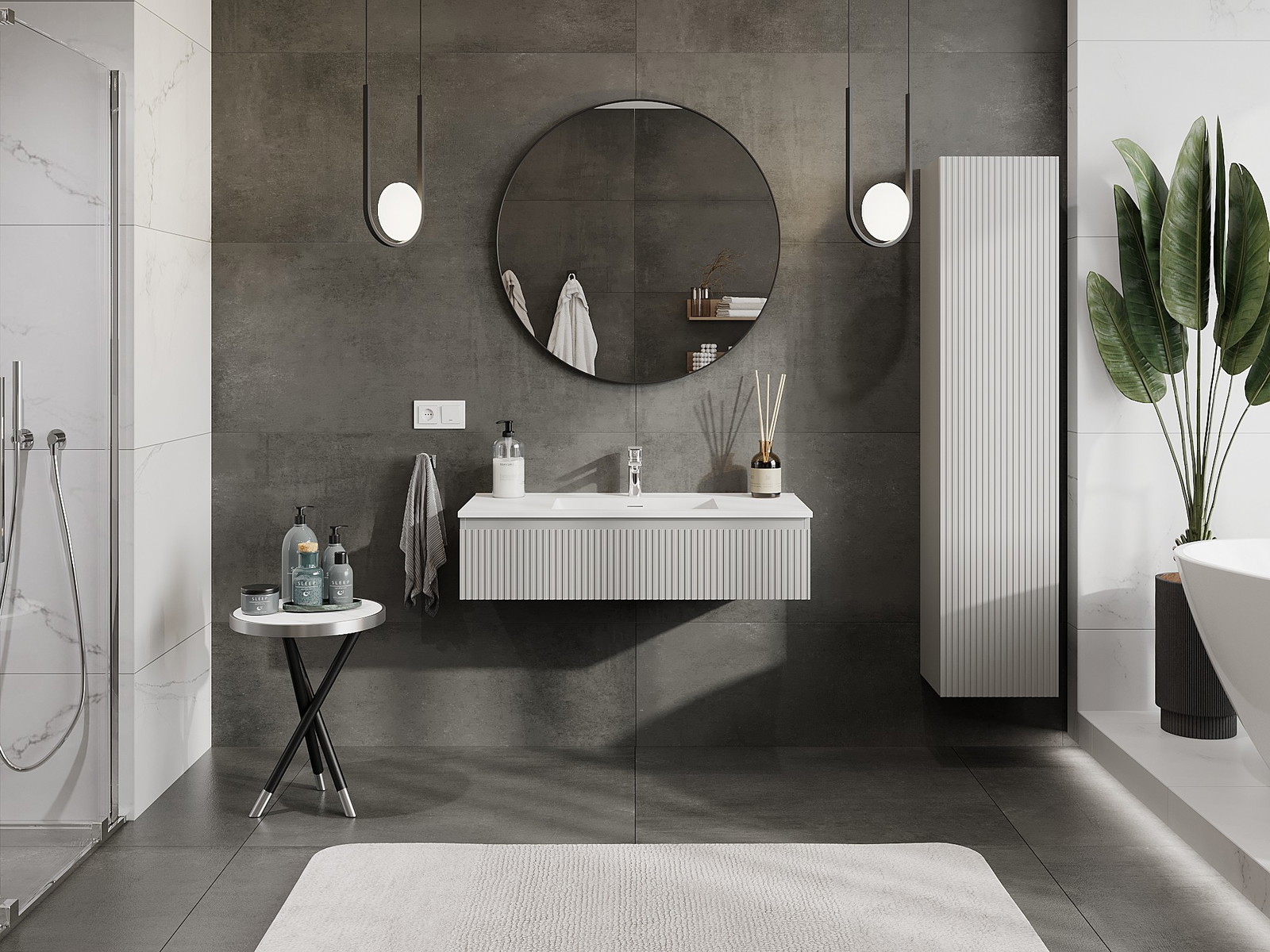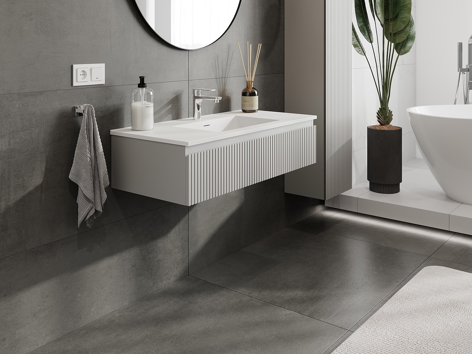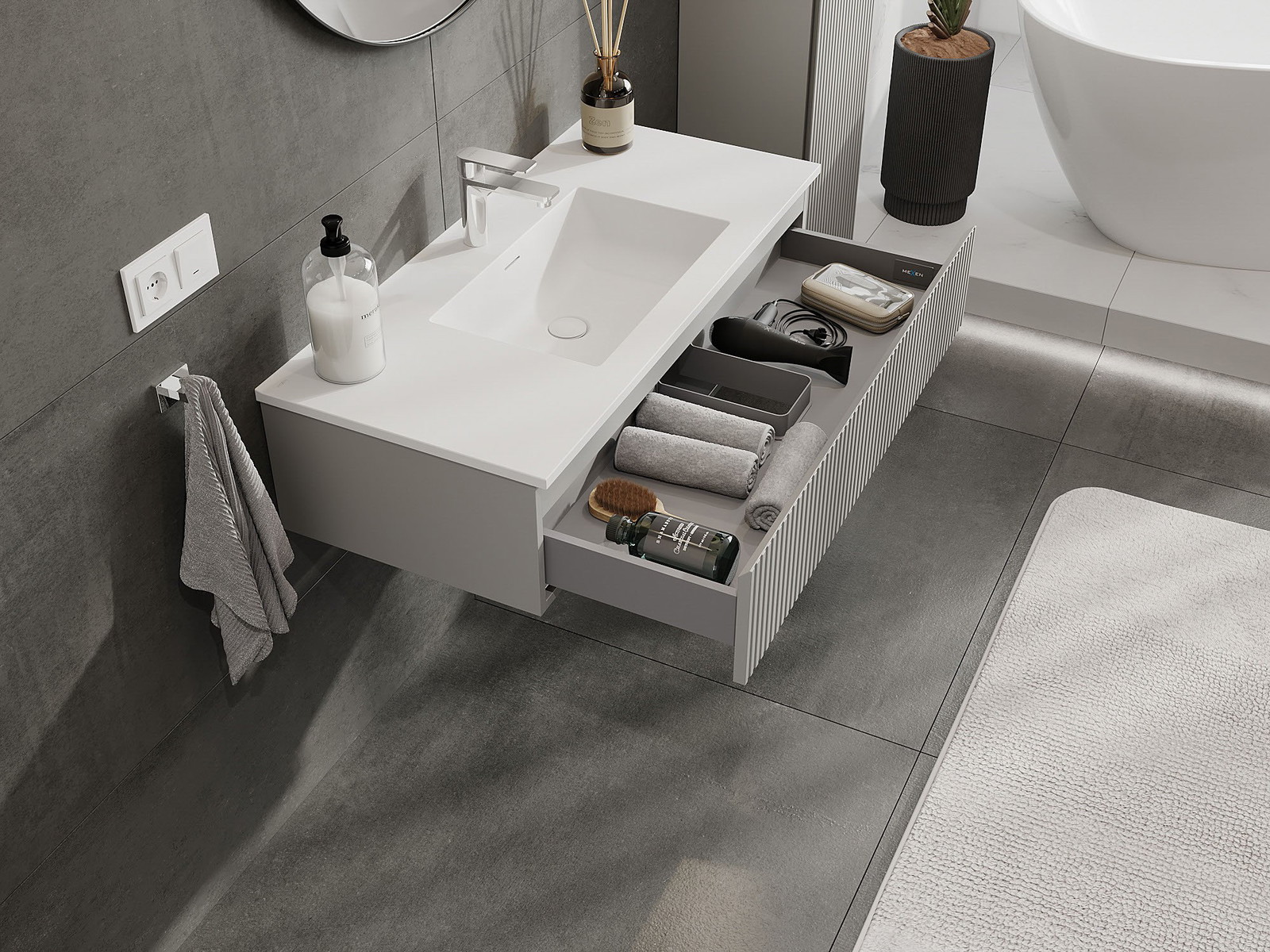 Mexen Rivel fürdőszobai szekrény 100 cm-es Otis mosdóval, 1 fiók, bordázott, szürke matt/fehér matt - 91A20-10023-1-BF62-W18M01