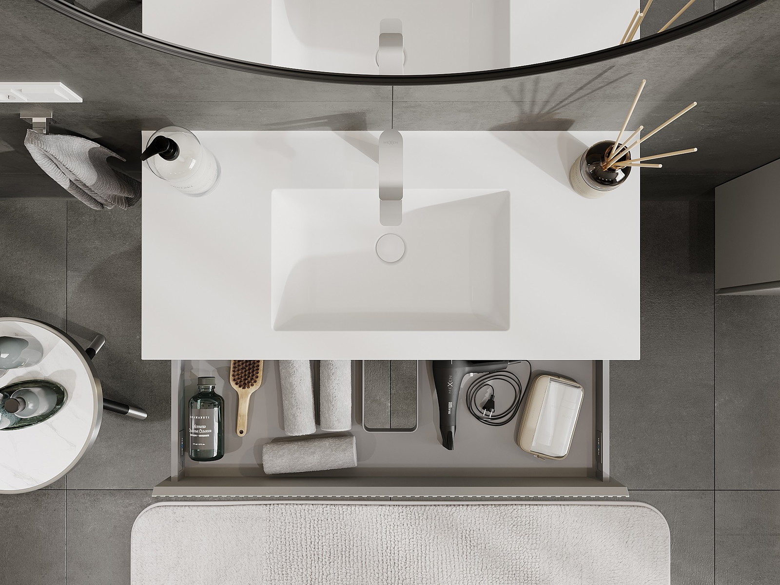 A fiókban lévő kivágás úgy van kialakítva, hogy befogadja a mosdó telepítéseknél szükséges szifont. Ennek köszönhetően a bútor teljesen funkcionálisan felszerelhető anélkül, hogy a fiók terének egy részét fel kellene áldozni a telepítés miatt.