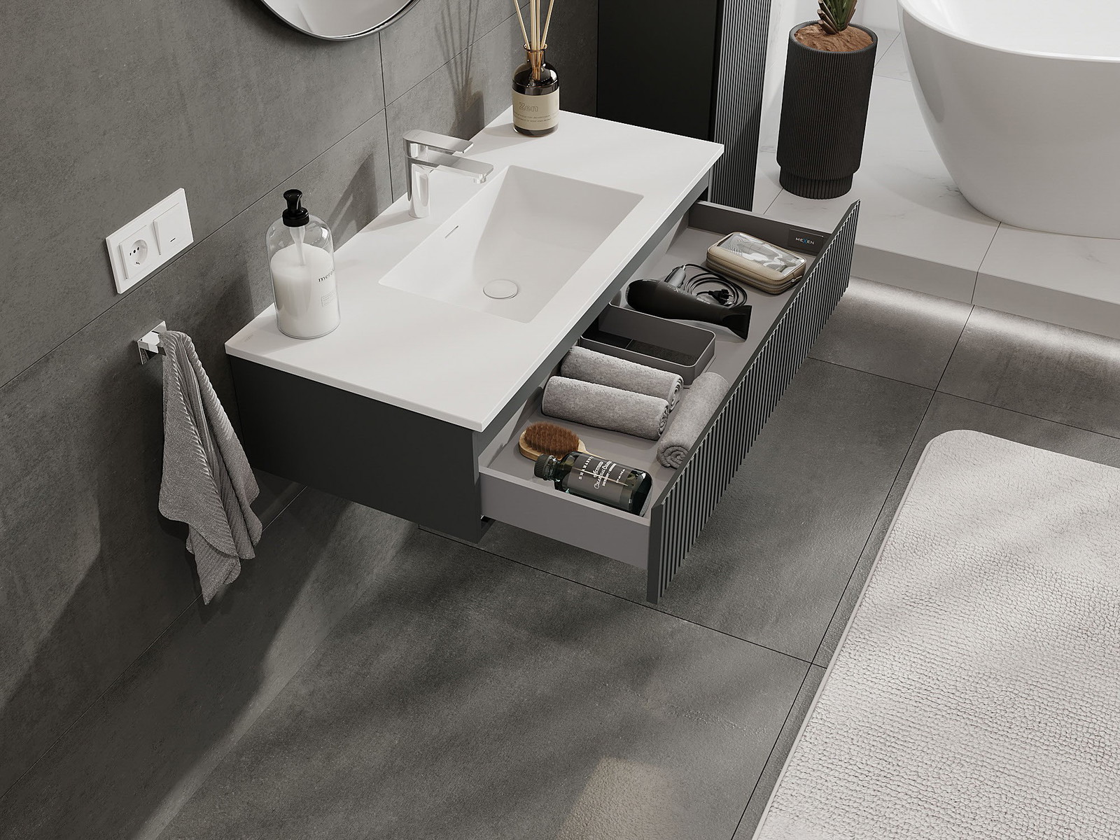 Mexen Rivel 100 cm-es fürdőszobai szekrény Otis mosdóval, 1 fiók, bordázott, grafit matt/fehér matt - 91A20-10023-1-BF66-W18M01