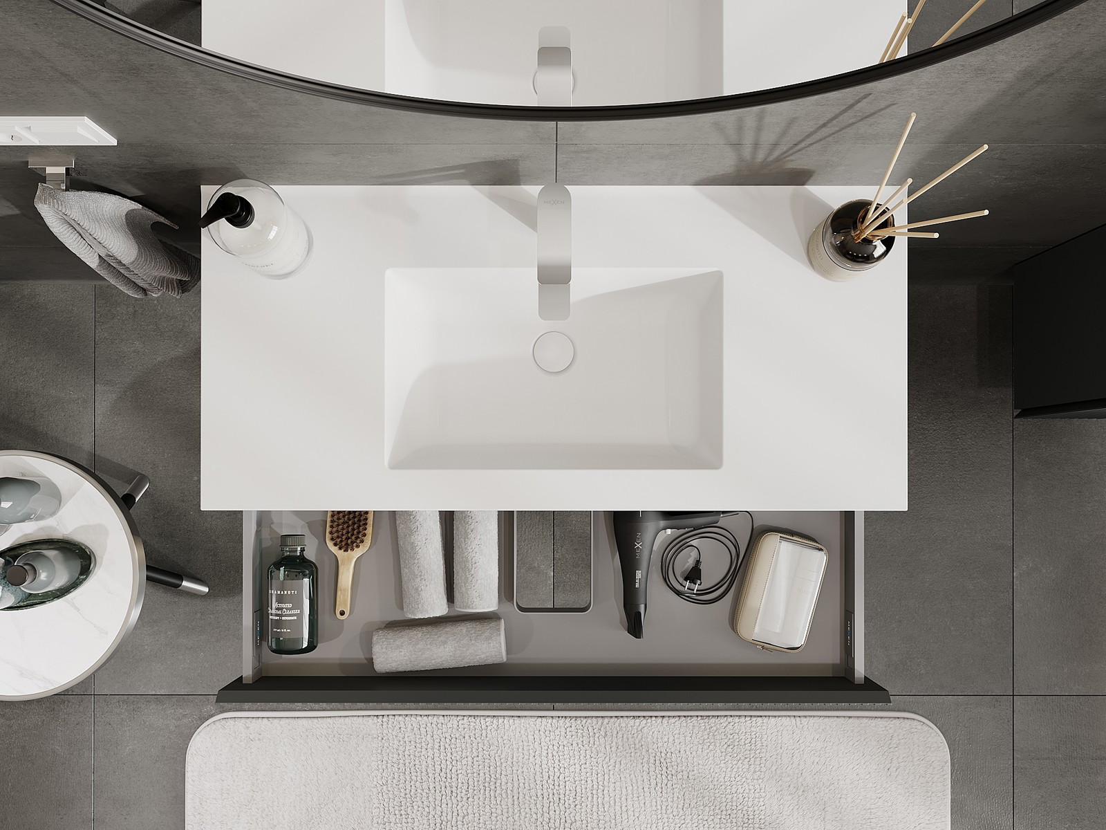 A fiókban lévő kivágás úgy van kialakítva, hogy befogadja a mosdó telepítéseknél szükséges szifont. Ennek köszönhetően a bútor teljesen funkcionálisan felszerelhető anélkül, hogy a fiók terének egy részét fel kellene áldozni a telepítés miatt.