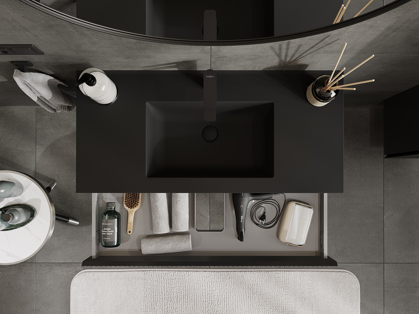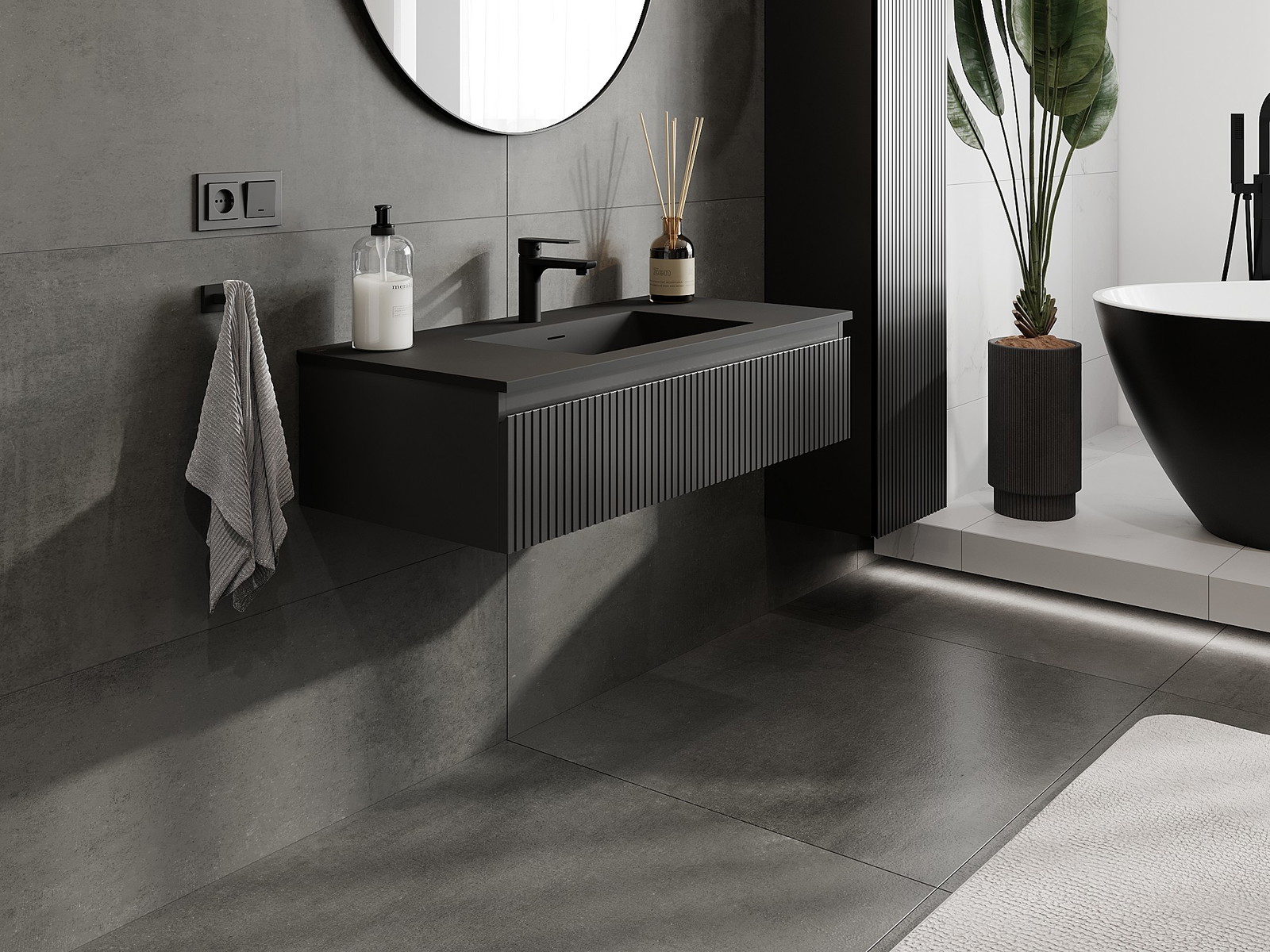 Mexen Rivel 100 cm fürdőszobai szekrény Otis mosdóval, 1 fiók, bordázott, fekete matt - 91A20-10023-1-BF71-W18M71