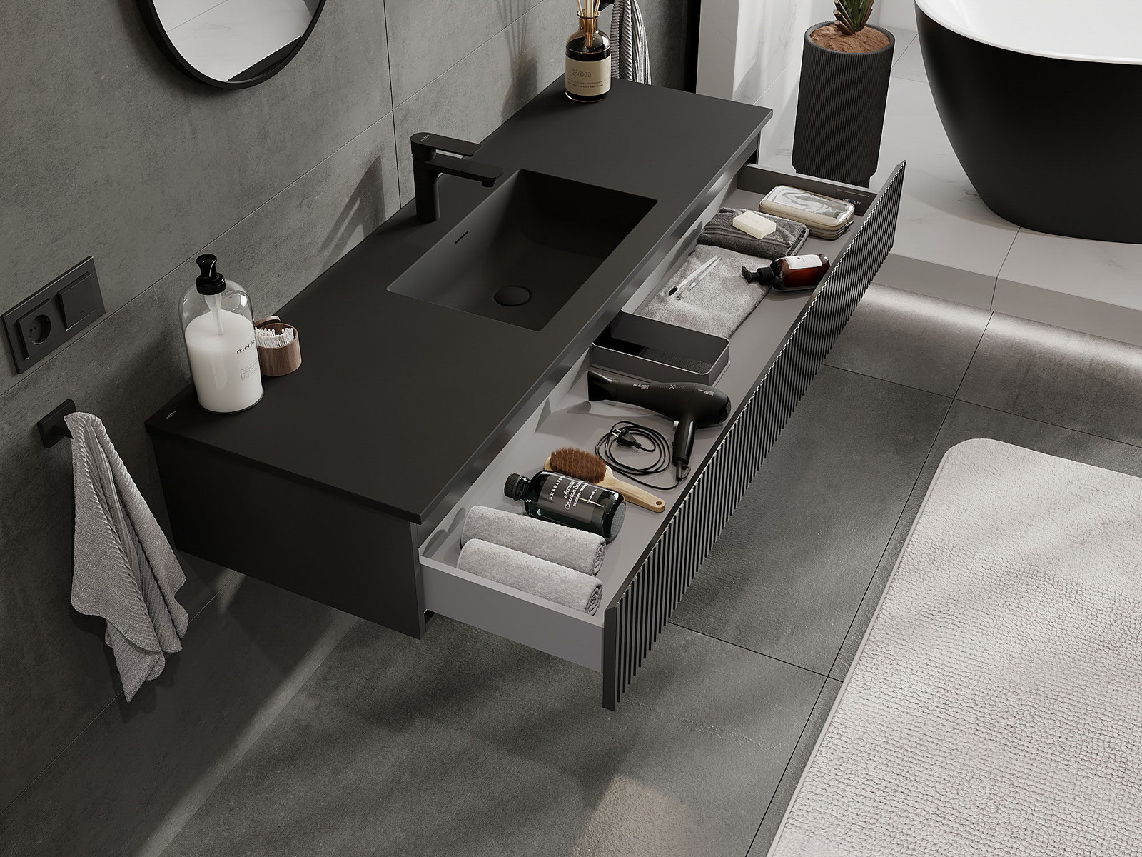 Mexen Rivel 140 cm-es fürdőszobai szekrény Otis mosdóval, 1 fiók, barázdált, fekete matt - 91A20-14023-1-BF71-W18M71