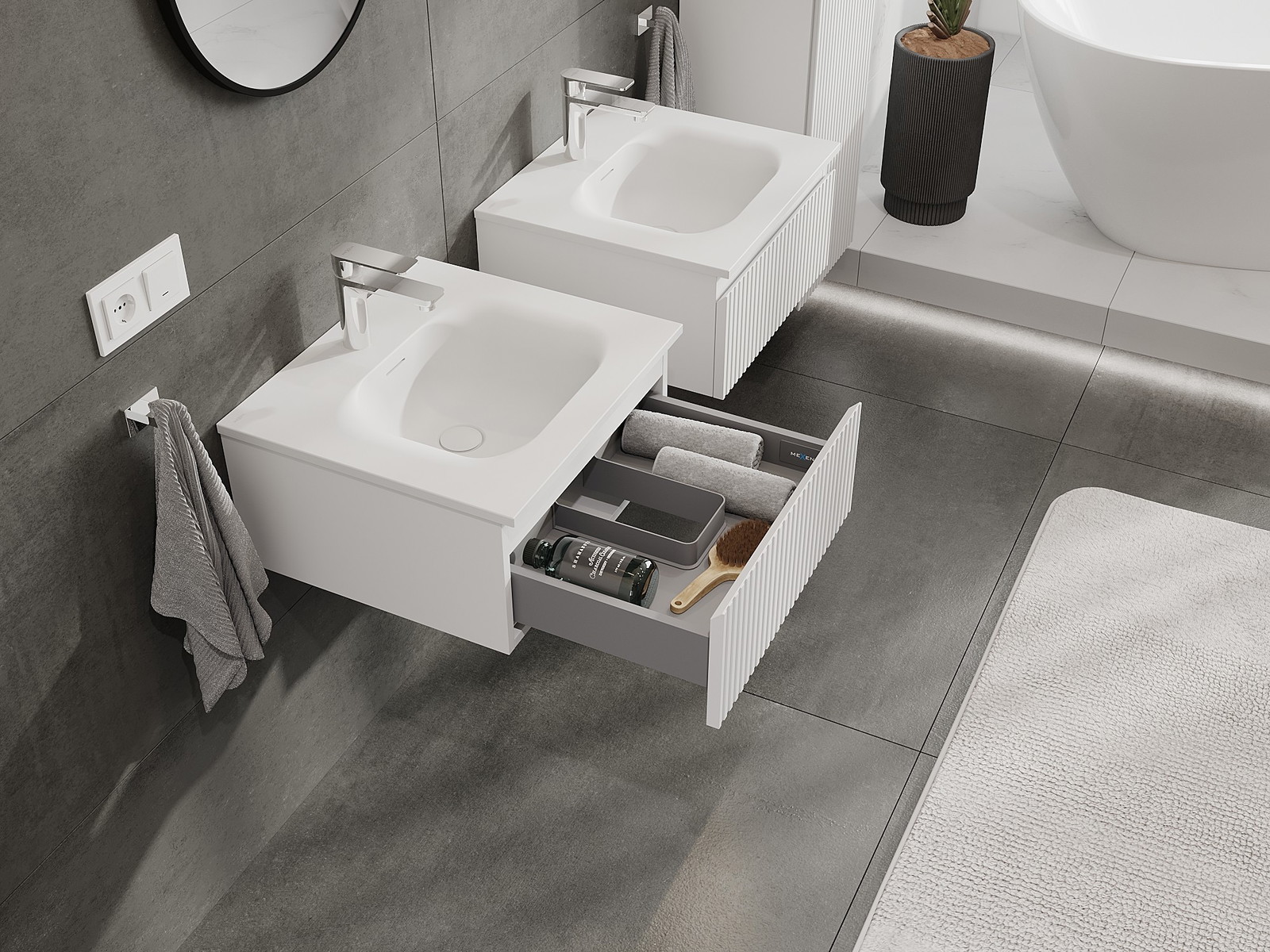 A moduláris fürdőszobabútorainkat különböző színkonfigurációkban lehet kombinálni, lehetővé téve a teljes személyre szabást. Kiválasztható mind az egyes elemek megjelenése, mind pedig funkciói, ami lehetővé teszi a bútorok személyes stílus- és használati preferenciákhoz való igazítását.